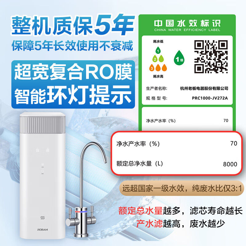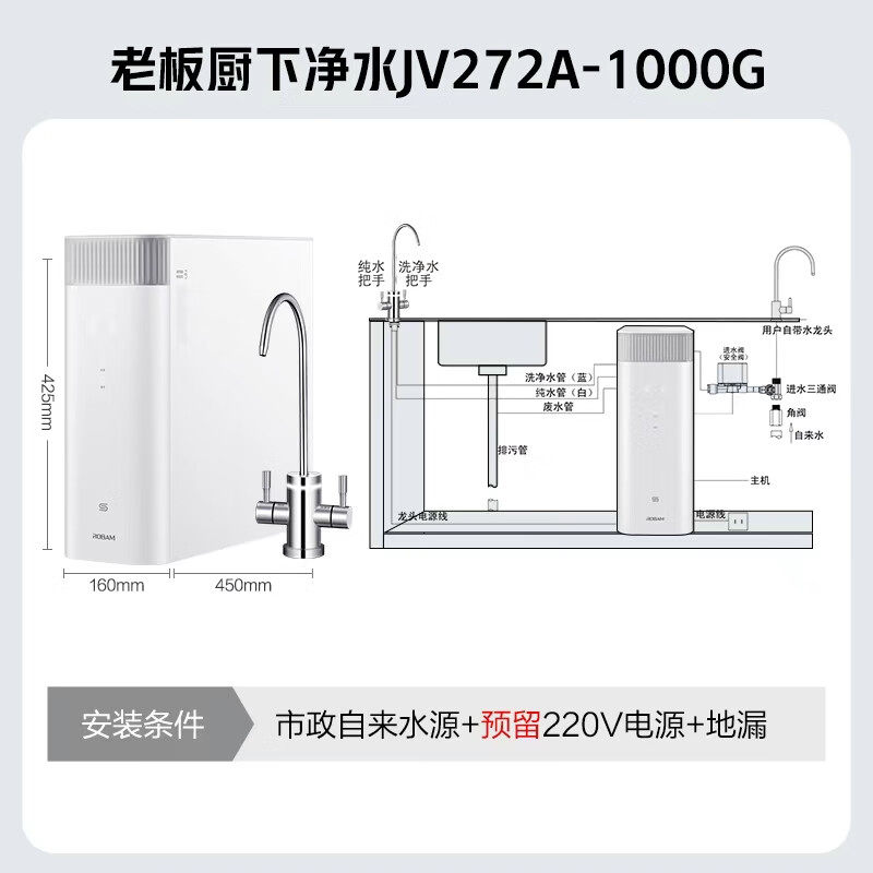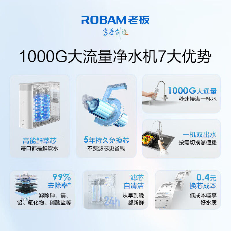 老板净水器家用直饮机1000G双出水RO反渗透厨下JV272A官方旗舰店