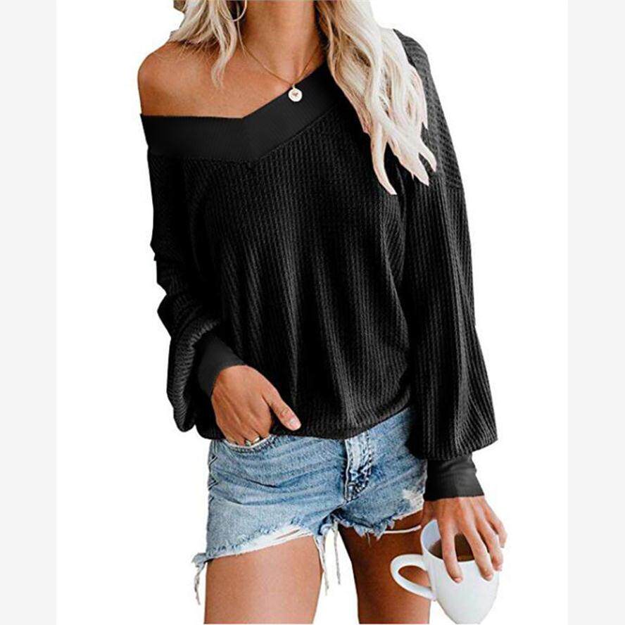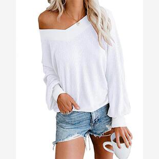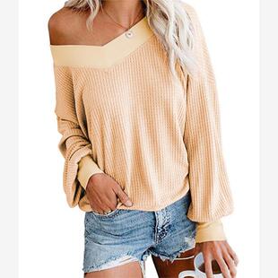 新款 学院纯色V领宽松长袖 shirt T恤上衣Women 欧美风2021春季