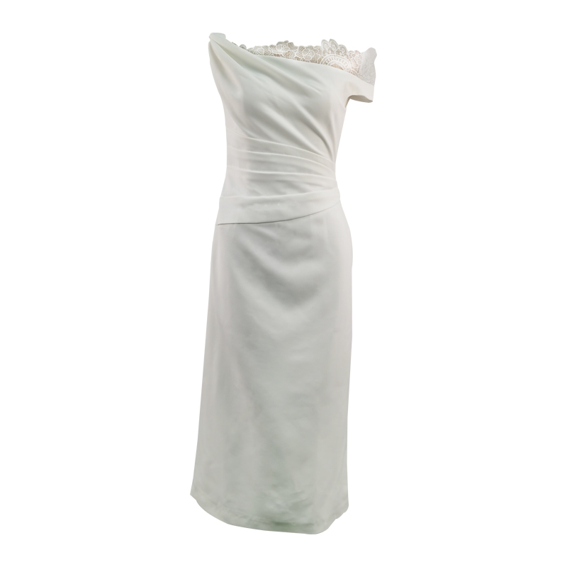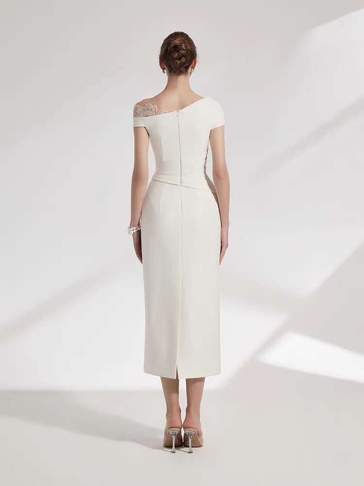 女神范斜肩小礼服设计师贵气感简约优雅宴会裙蕾丝拼接白色连衣裙