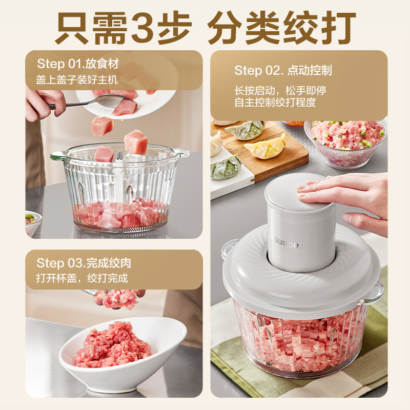 苏泊尔绞肉机家用316L不锈钢大容量多功能电动碎肉碎菜料理搅拌机
