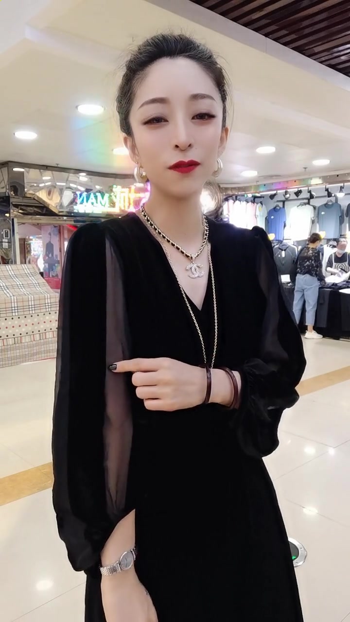 V领2023秋季 显瘦九分袖 雪纺裙子 金丝绒连衣裙女长裙韩版 网红同款