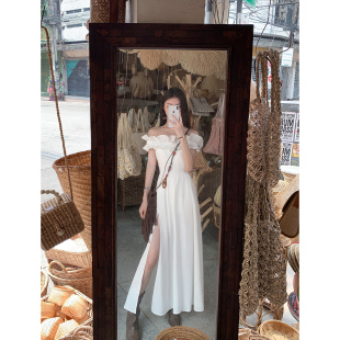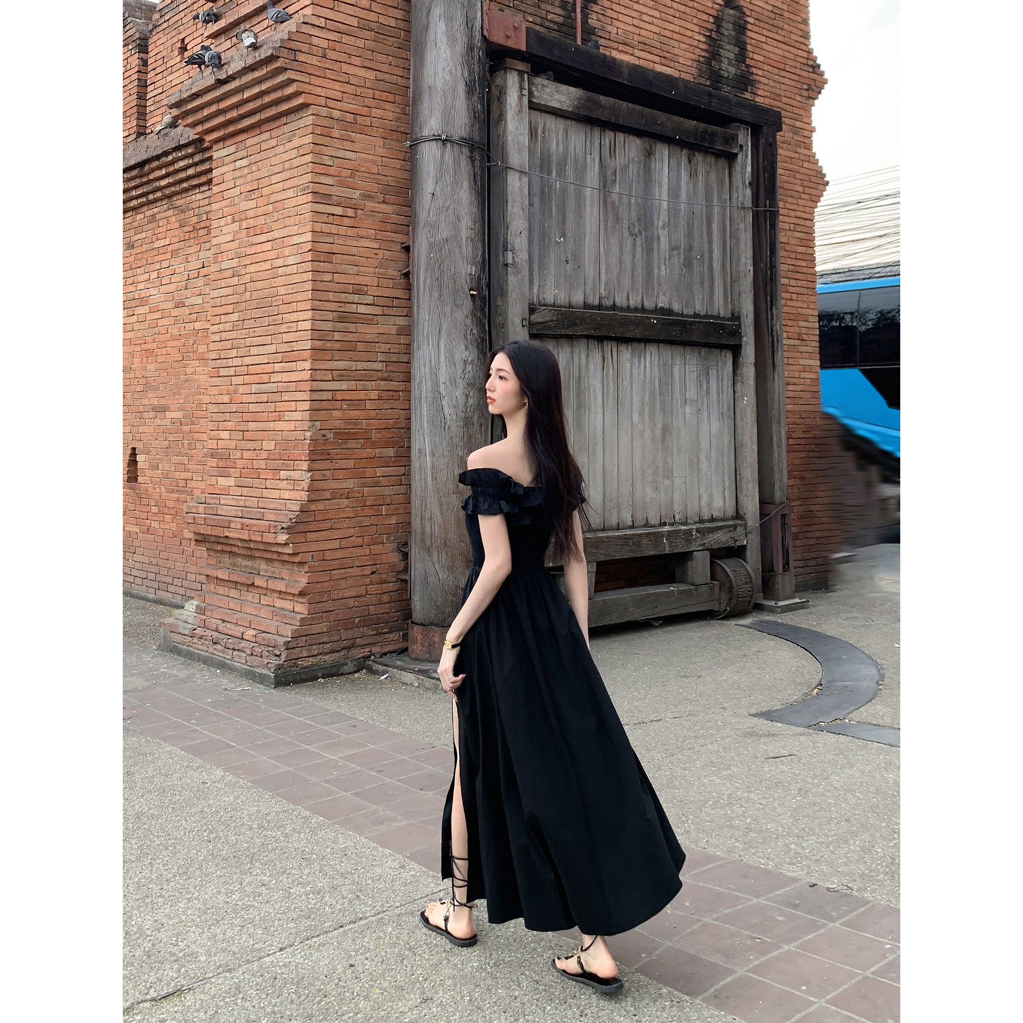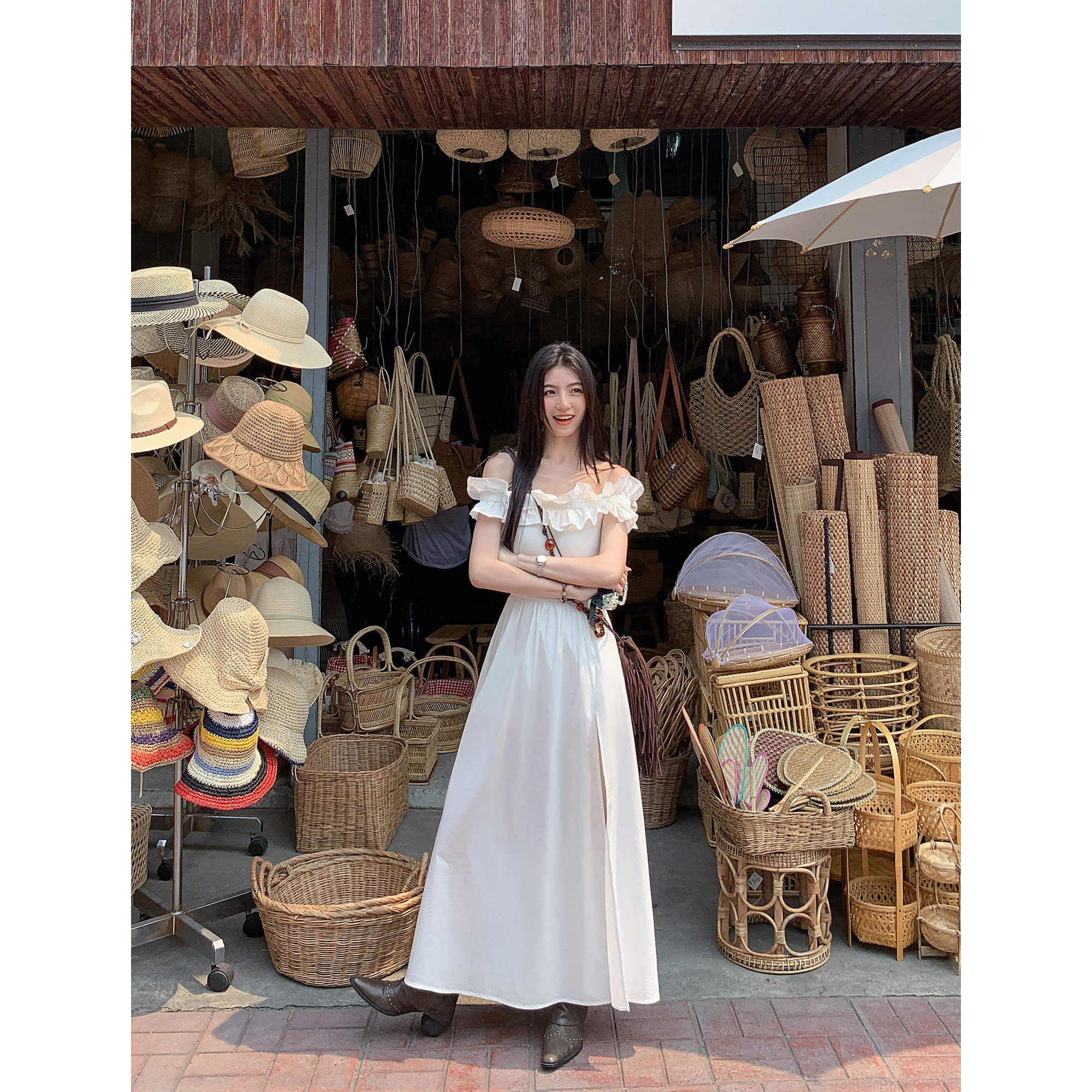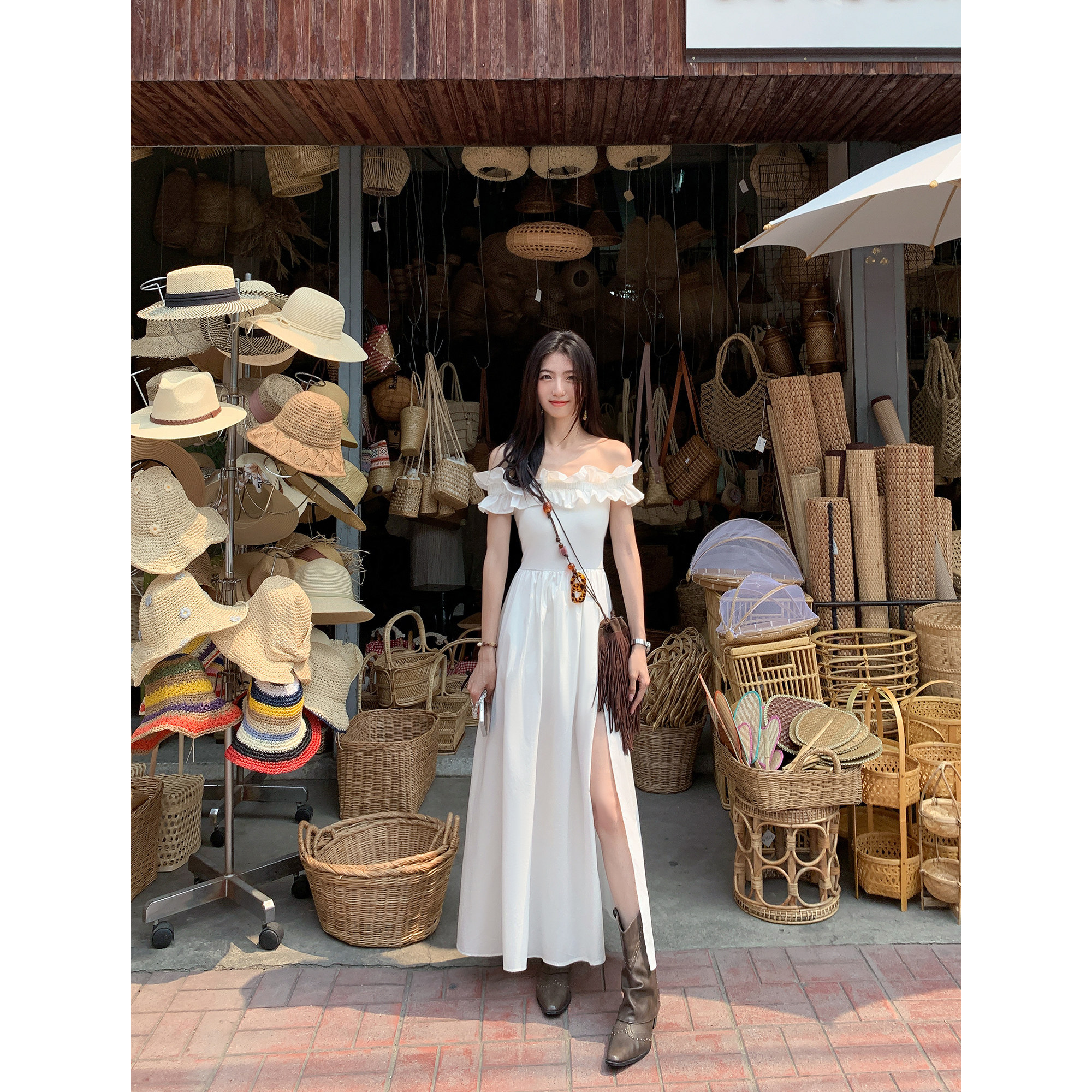 荷叶边一字肩连衣裙开叉长裙 漂亮姐姐有点甜 MULVAN 现货7折