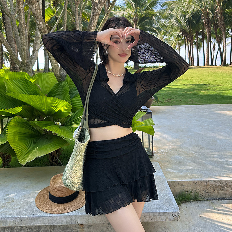 显瘦大码 罩衫 胖mm遮肉200斤泡温泉 分体钢托三件套长袖 泳衣女裙式