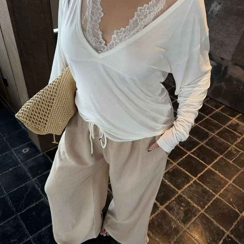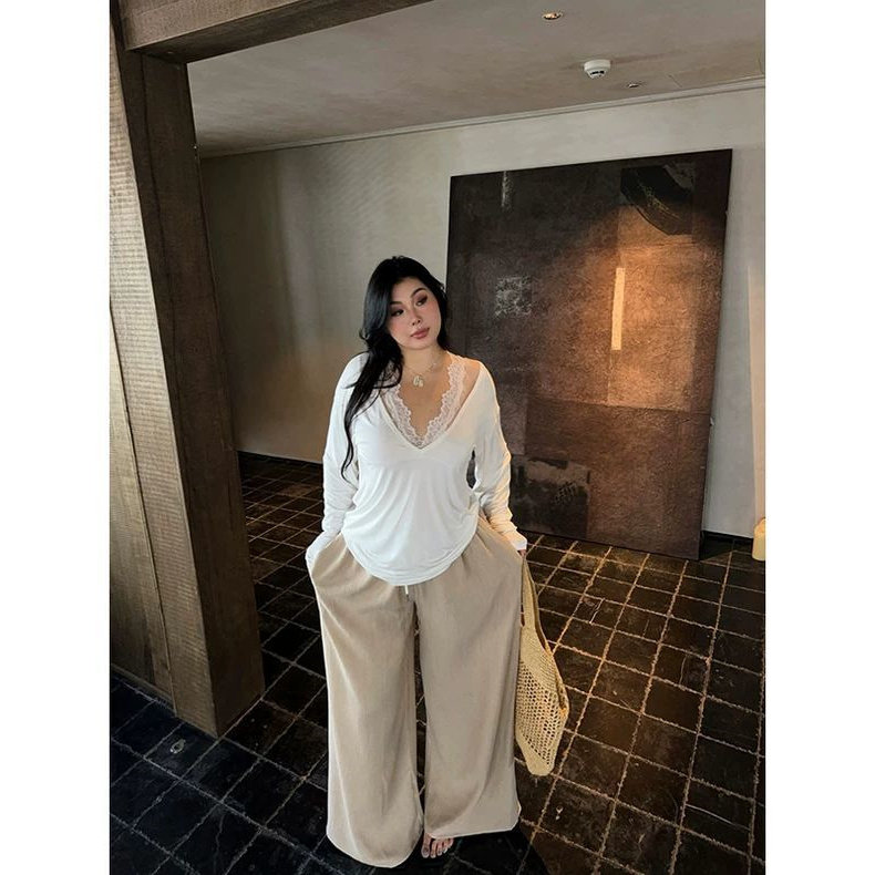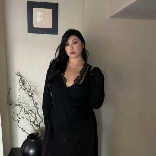 长袖 显瘦纯色时髦洋气春秋款 拼接蕾丝设计女上衣 300斤大码 胖mm2