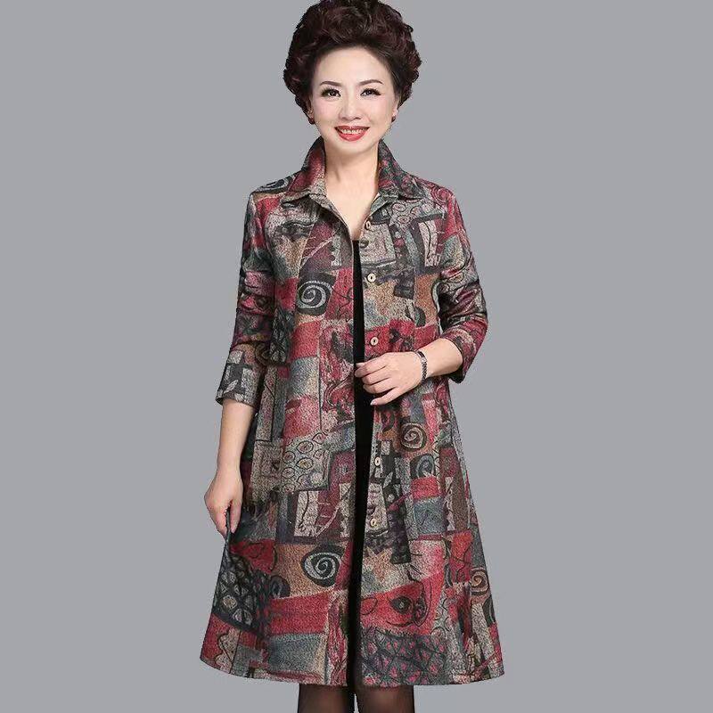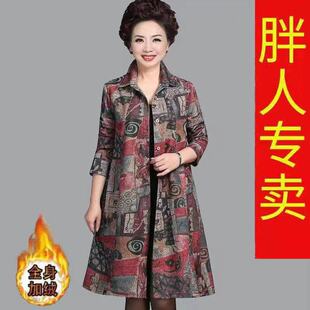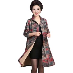 中长款 秋冬翻领衬衫 新款 印花外套加厚加绒中老年大码 风衣女 妈妈装