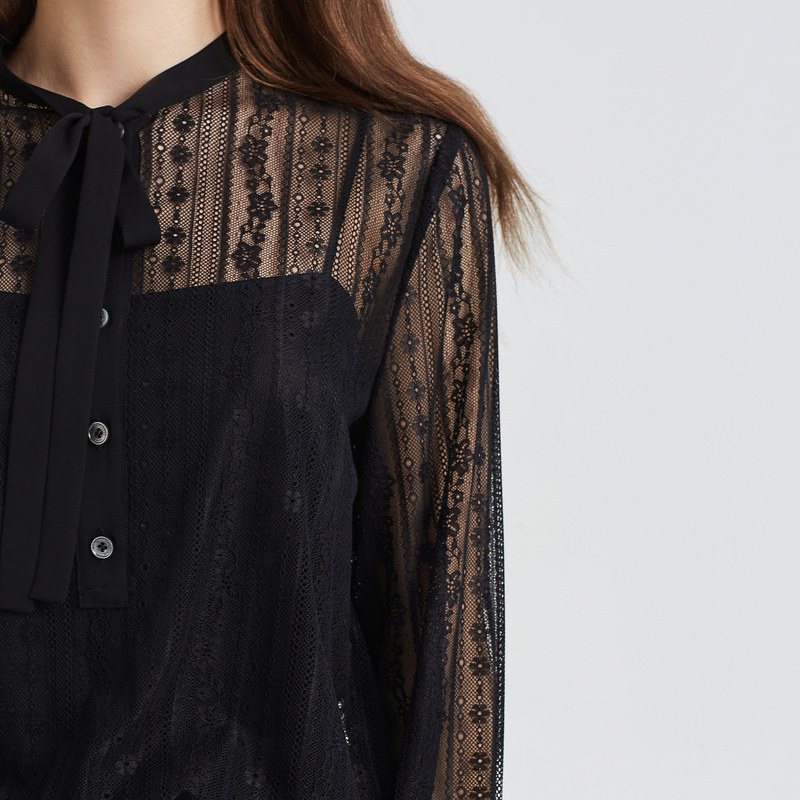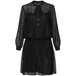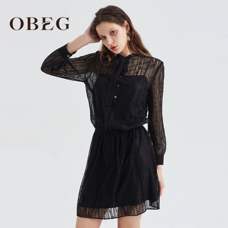 OBEG欧碧倩拼接连衣裙夏收腰气质小黑裙微透蕾丝裙子10402080