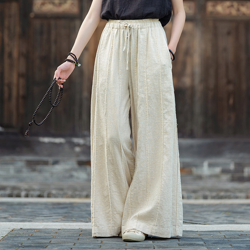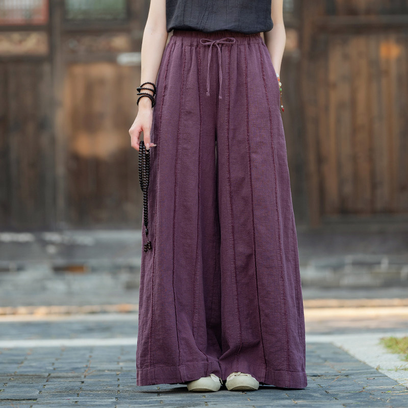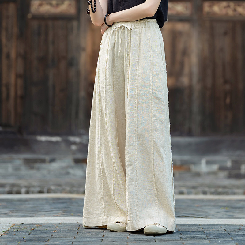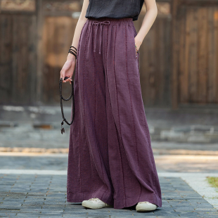 旅行禅修阔腿系绳拼接裙裤 个性 女宽松百搭做旧磨毛长裤 棉麻休闲裤
