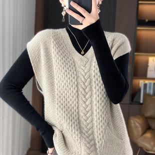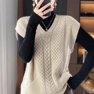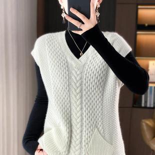 秋冬100%纯羊毛马甲女V领绞花叠穿无袖 毛衣羊绒针织带兜坎肩背心