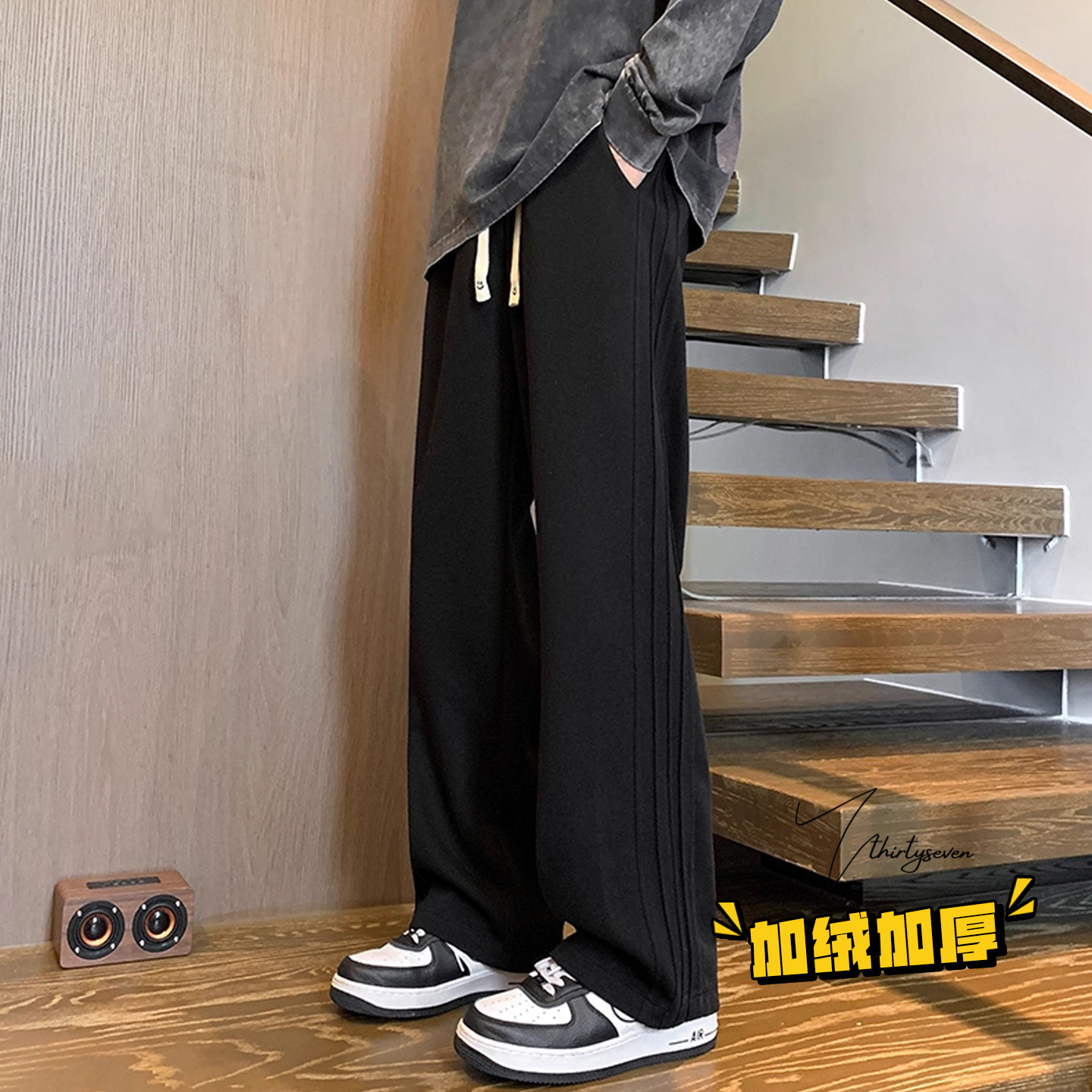 加绒街舞穿搭褶皱宽松休闲长裤 女秋冬季 子 灰色运动卫裤 自然涩美式