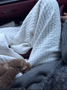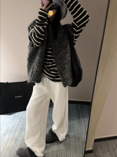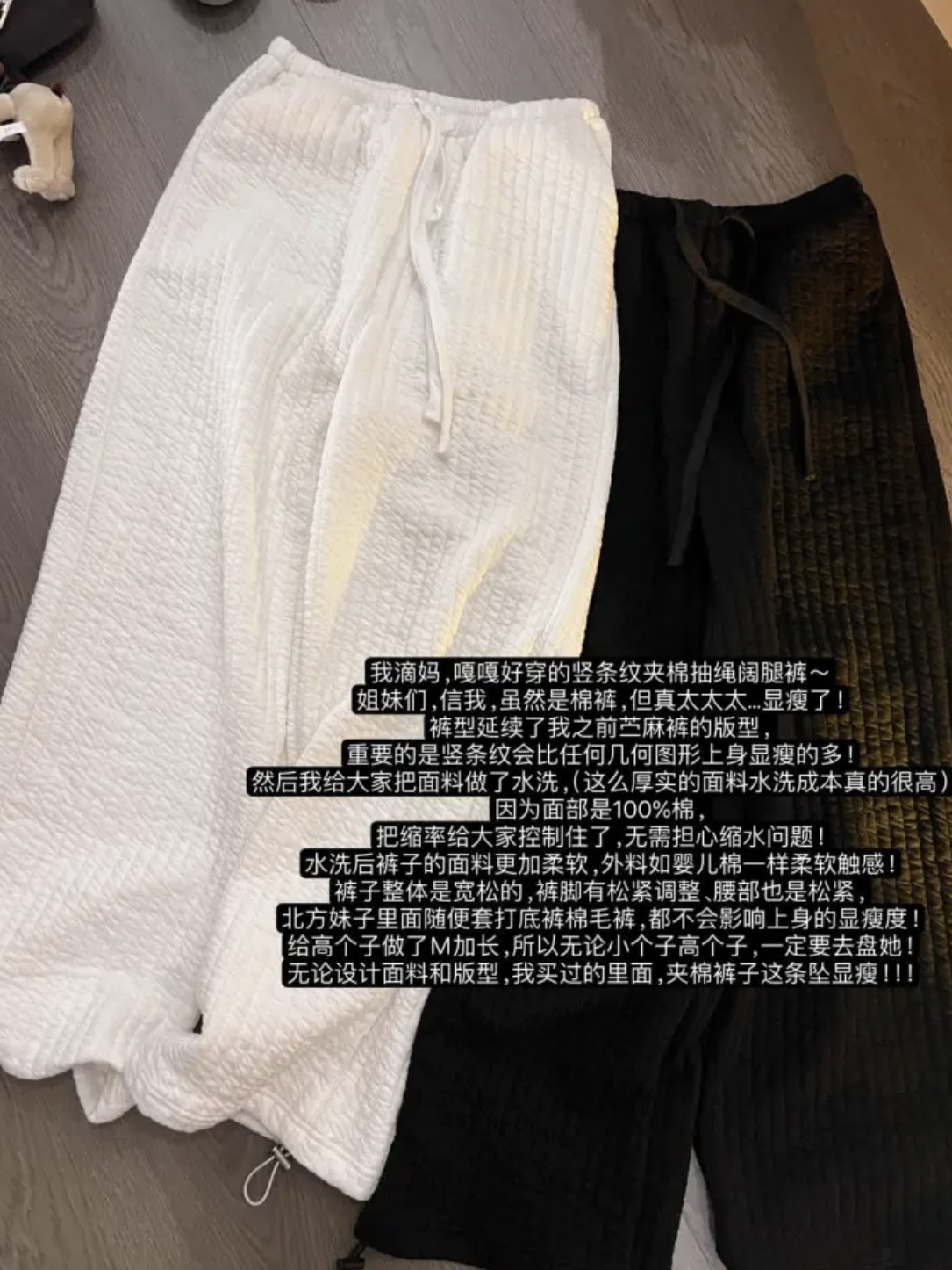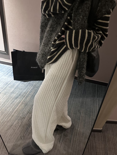 松紧腰阔腿棉裤 100%棉 嘎嘎显瘦竖条纹绗缝夹棉宽松直筒休闲裤