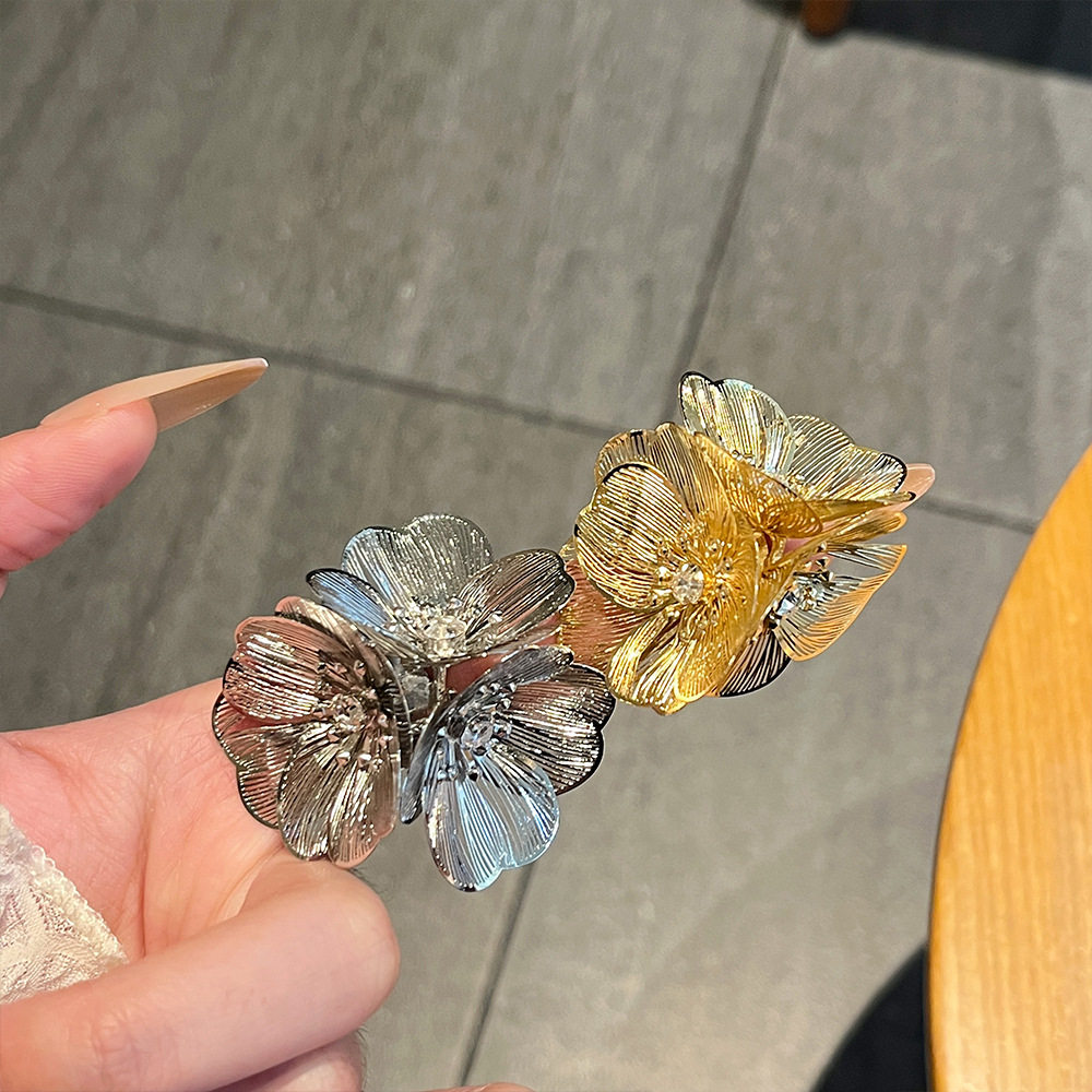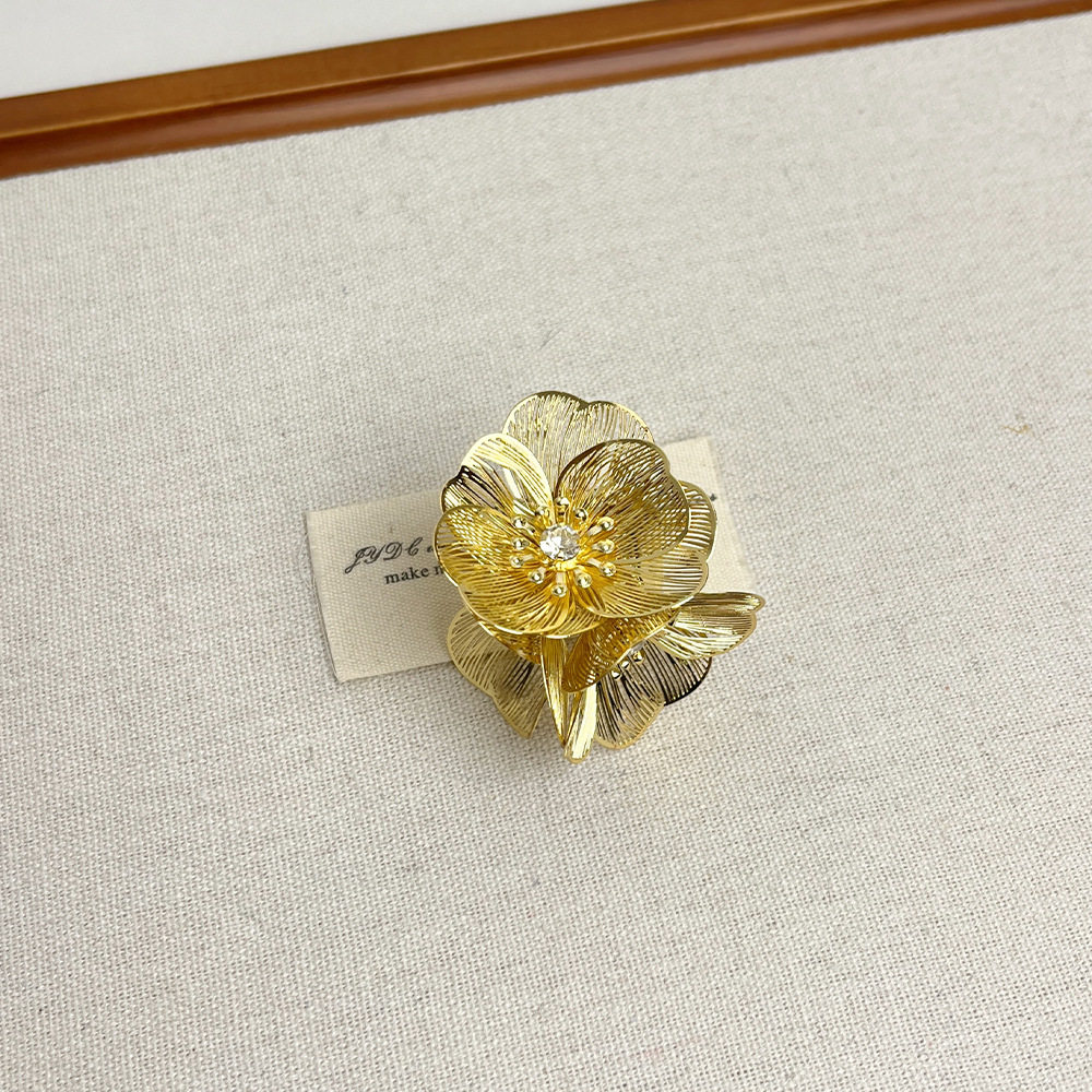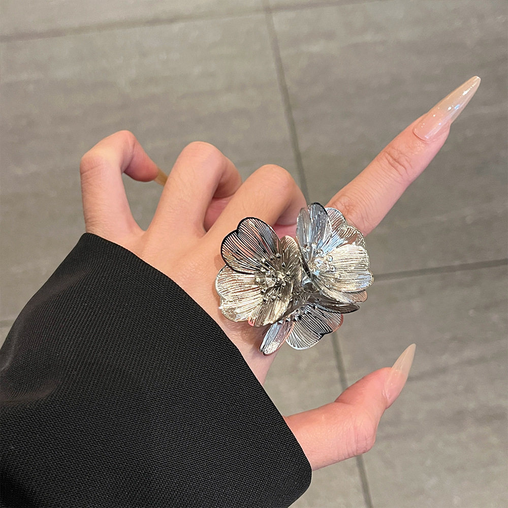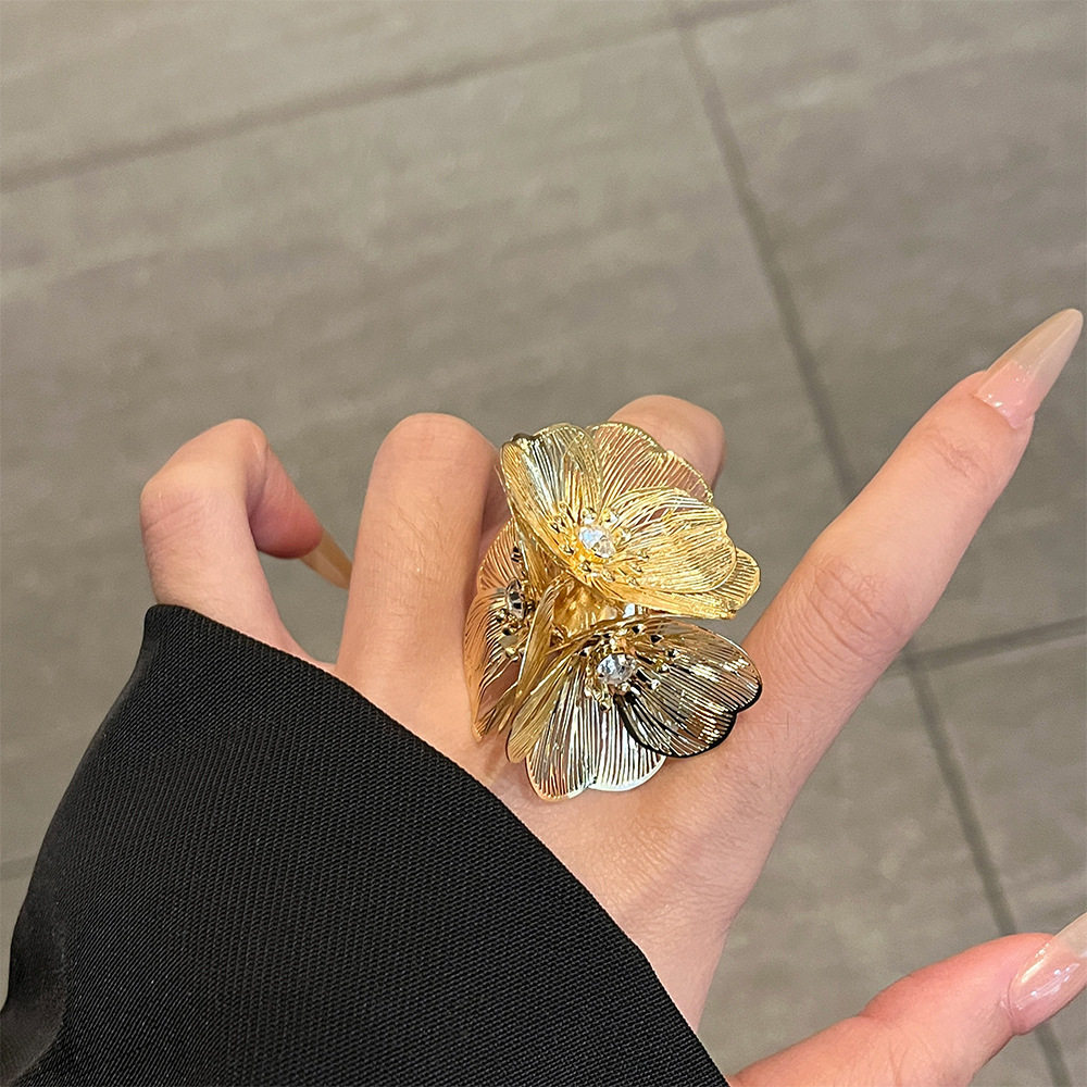 小香风瀑布鱼尾纹花朵闪钻戒指 小众时髦金属开口高级感百搭指环