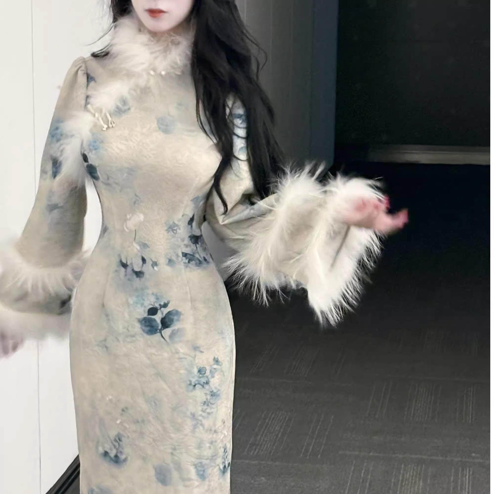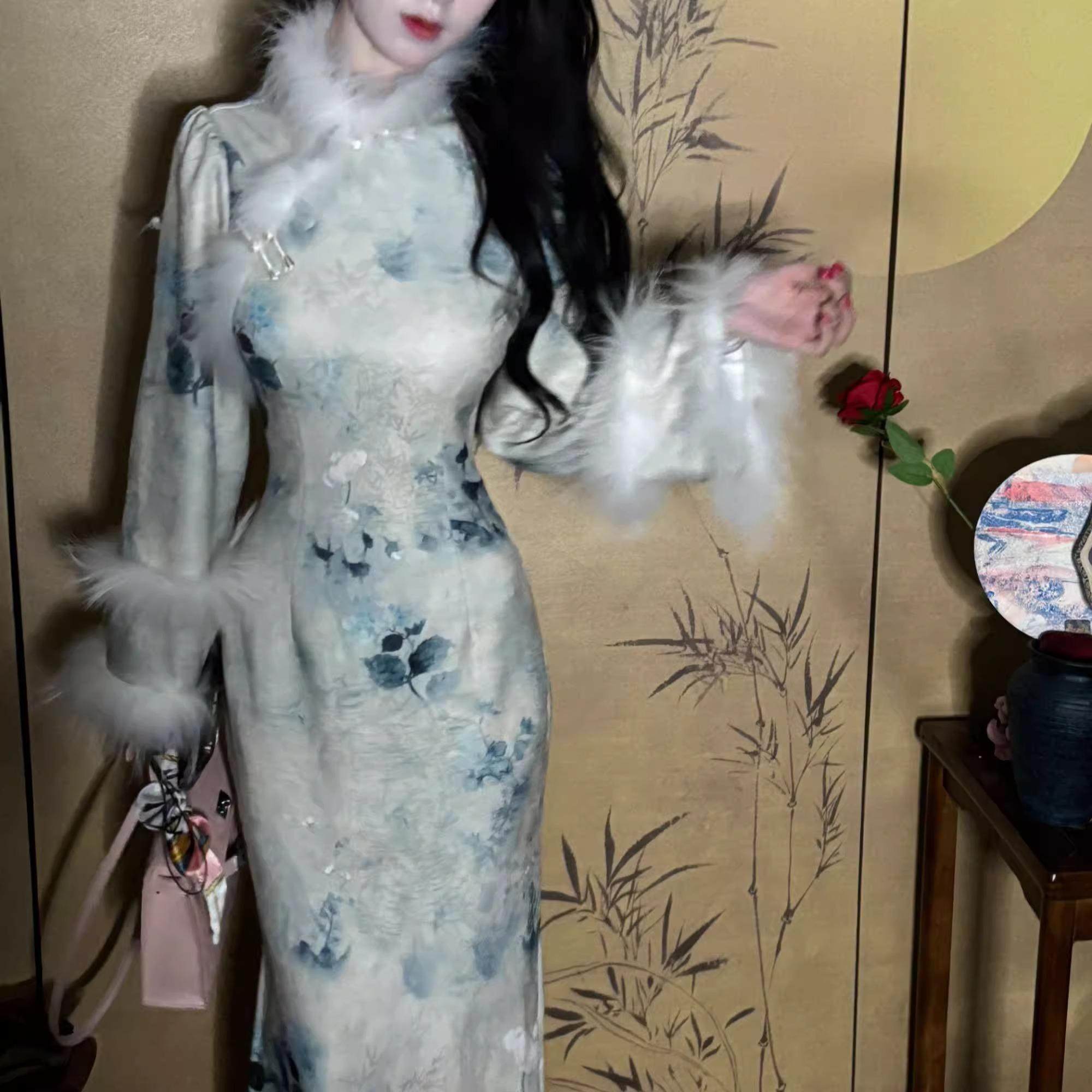 加绒加厚少女连衣裙10 蓝色绝美秋冬款 旗袍新中式 长袖 改良版