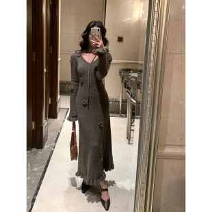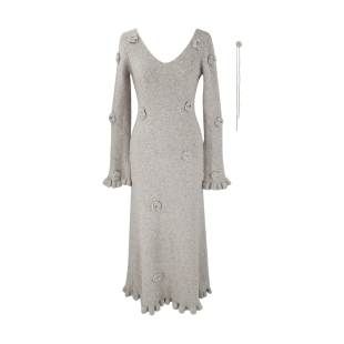 V领收腰修身 花朵显瘦针织连衣裙女冬季 长裙子 法式 SYT自制