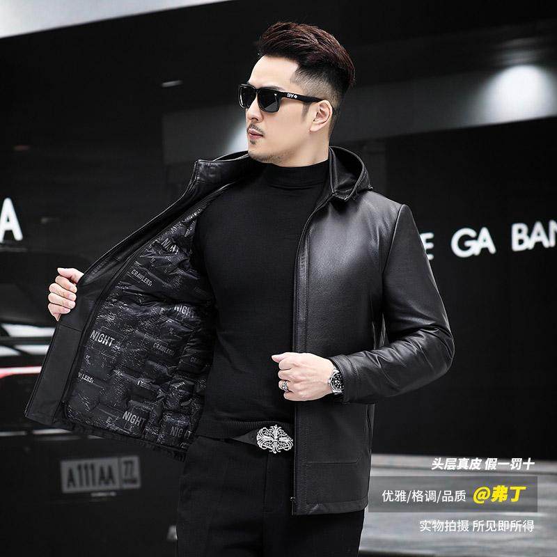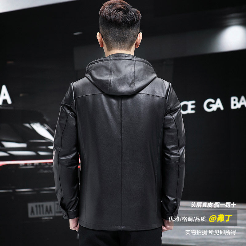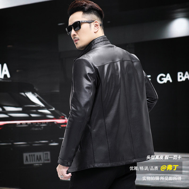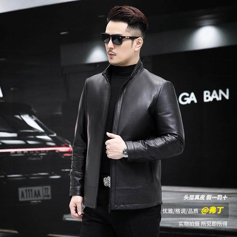 头层薄软牛皮真皮皮衣男修身 翻领简约商务休闲机车夹克外套丹 短款