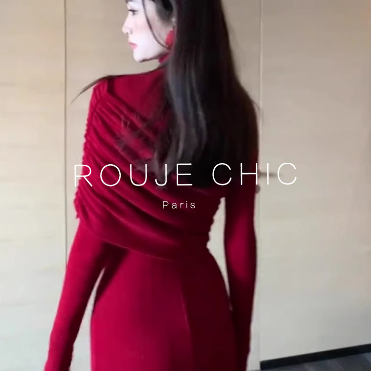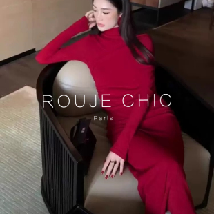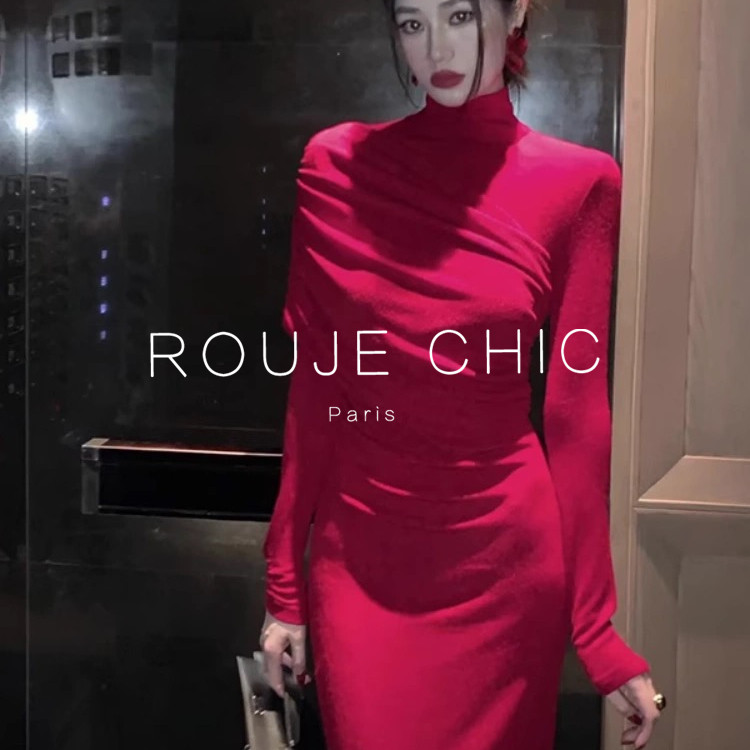 修身 御姐千金感高领褶皱红色连衣裙女春季 显瘦长裙 CHIC法式 ROUJE