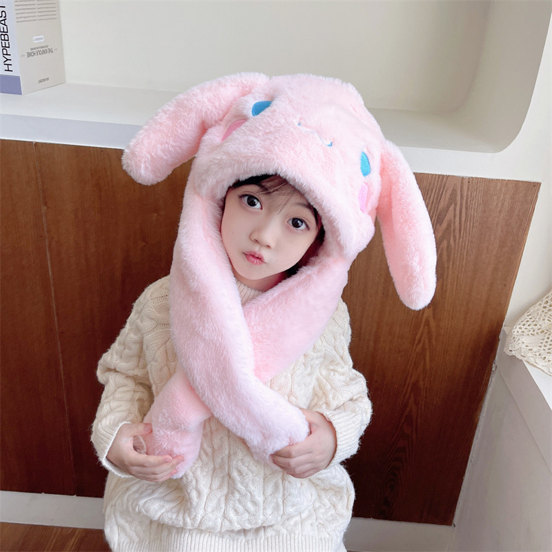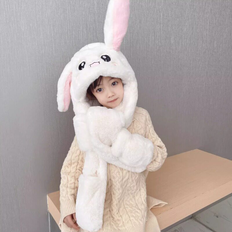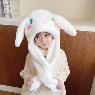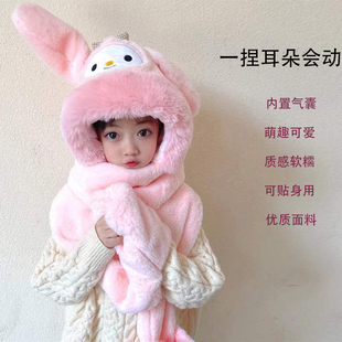 儿童帽子围脖一体秋冬女童兔耳朵会动围巾加厚毛绒可爱宝宝护耳帽