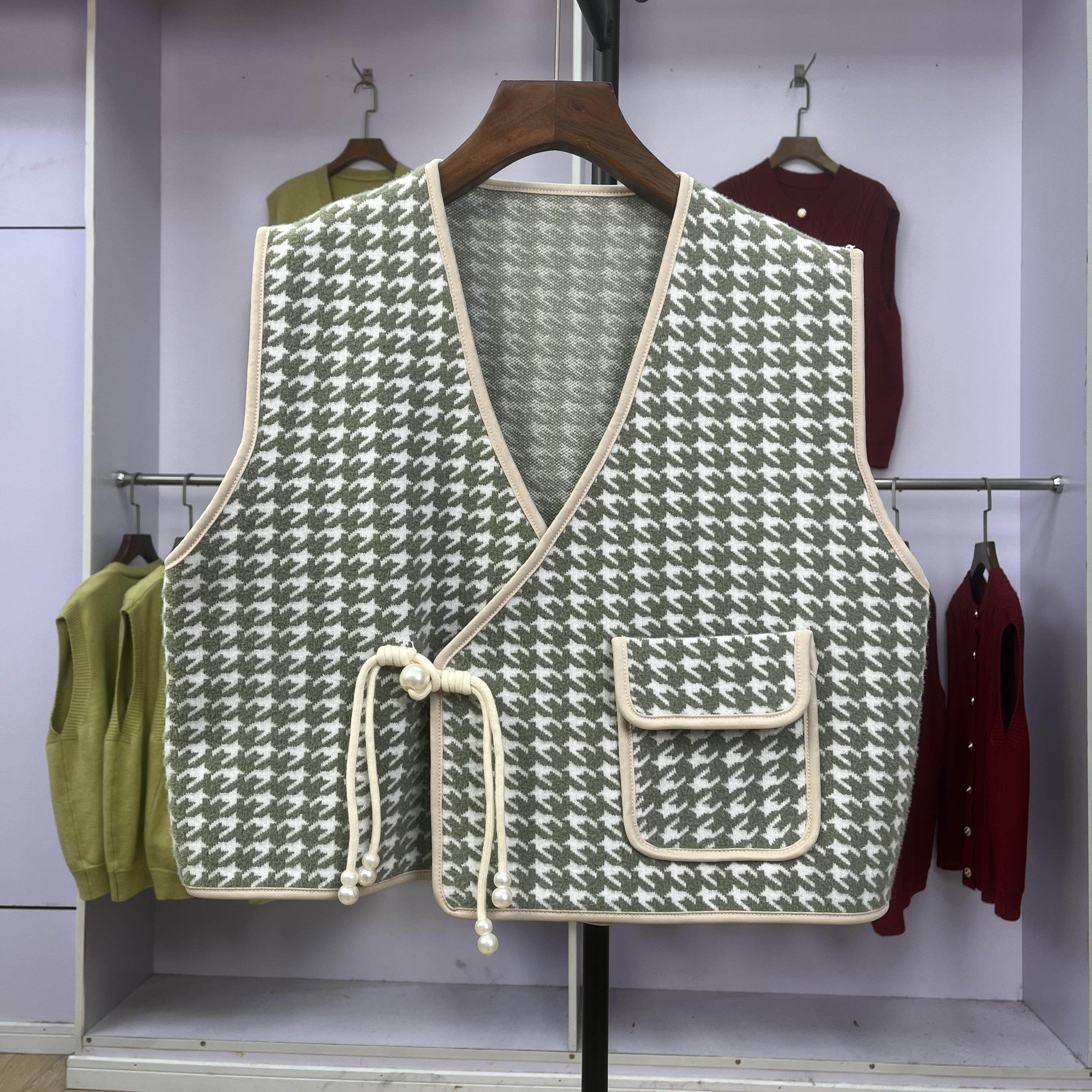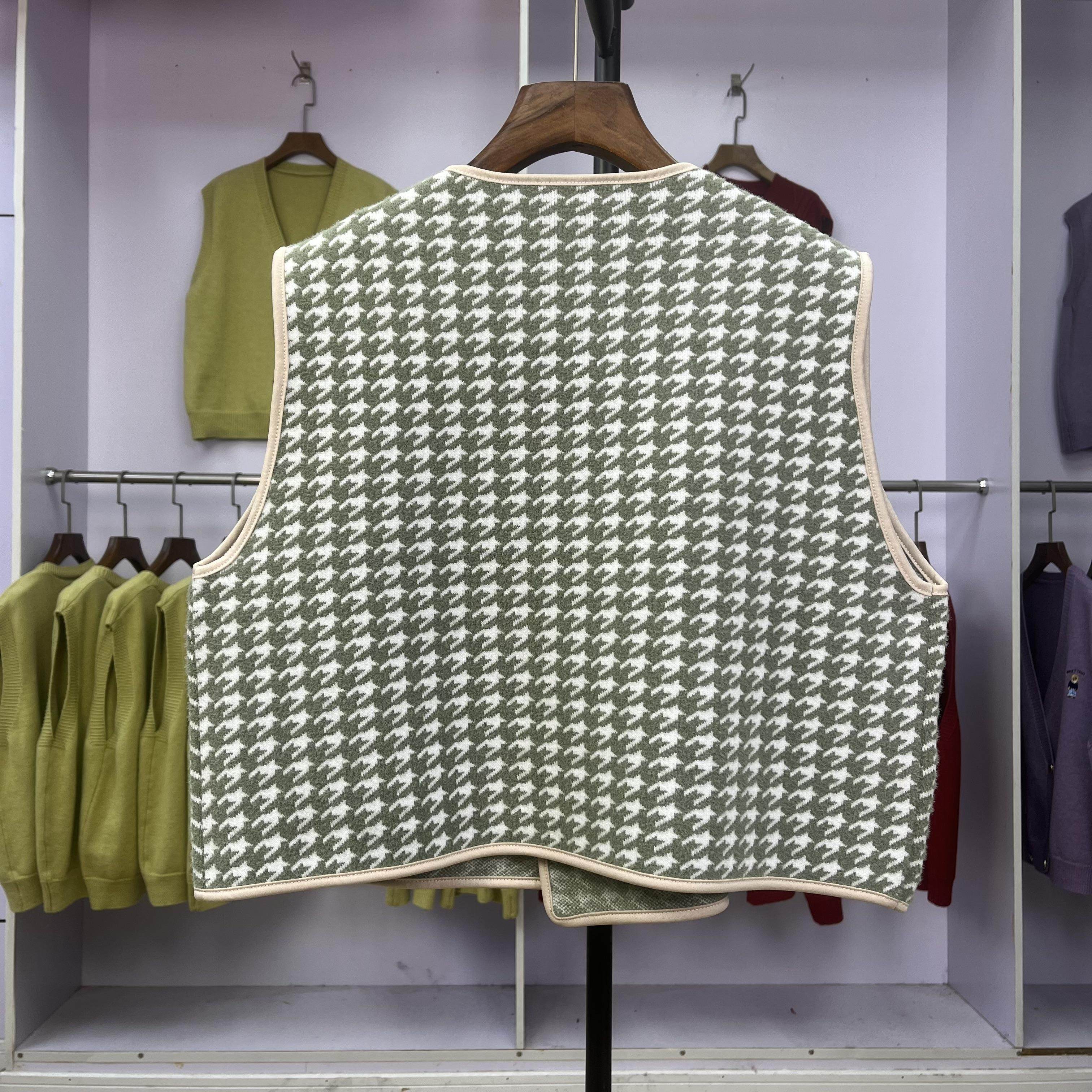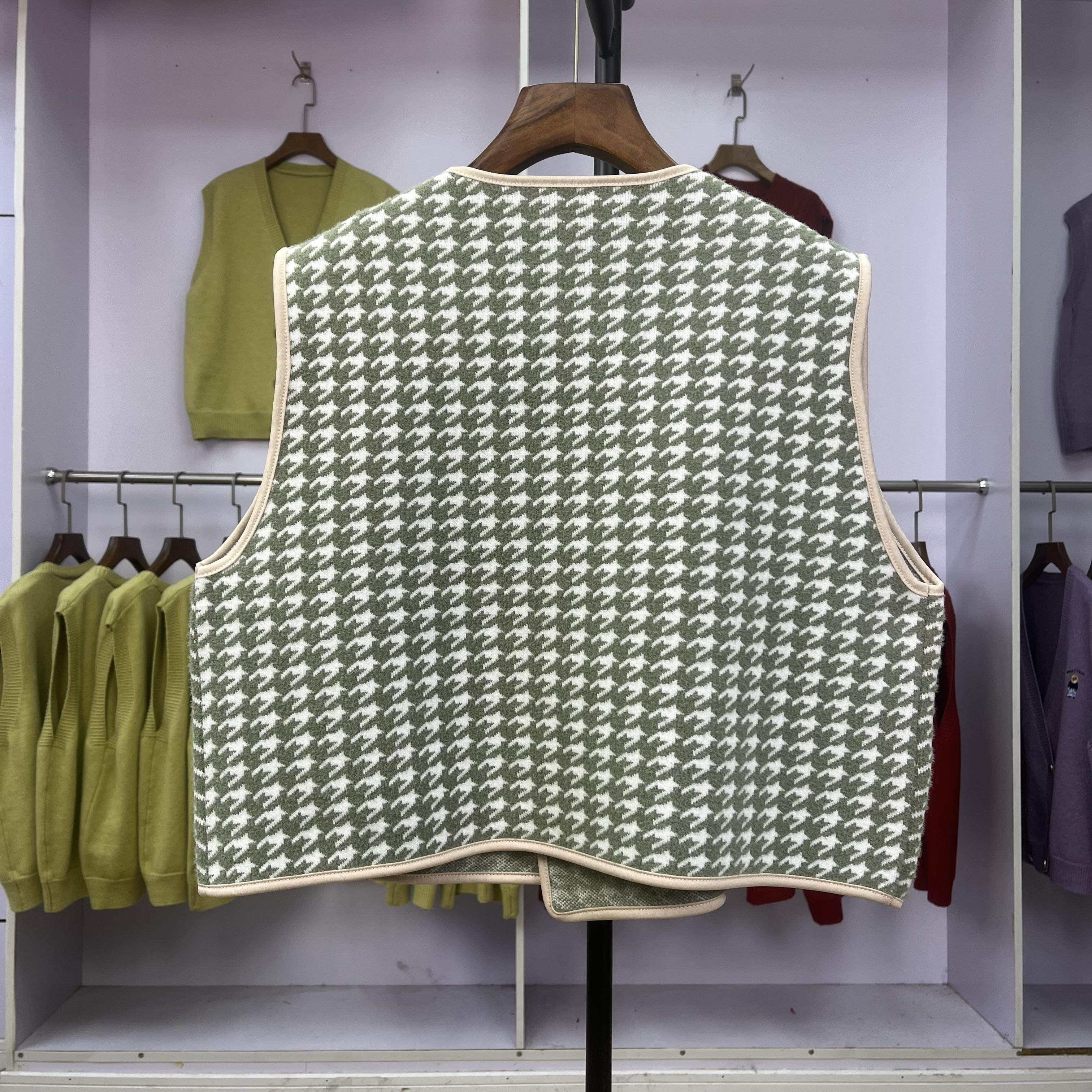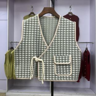 V领大码 打底衫 上衣时髦洋气显瘦针织马甲背心 千鸟格盘扣中式 099