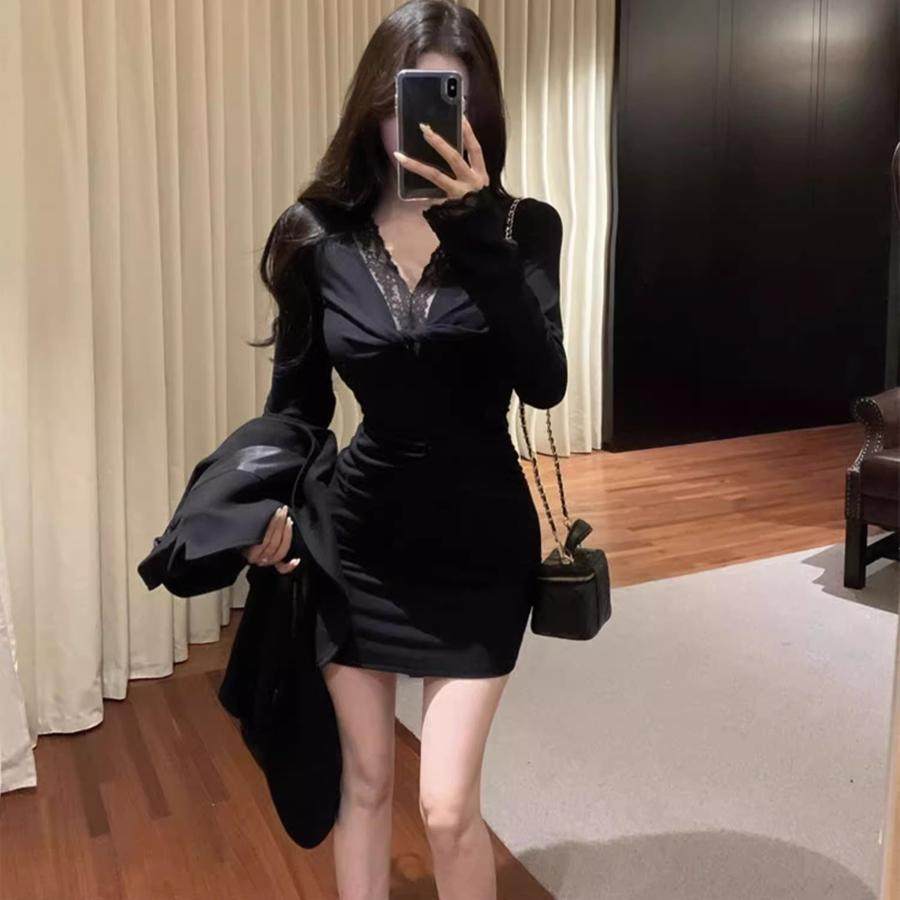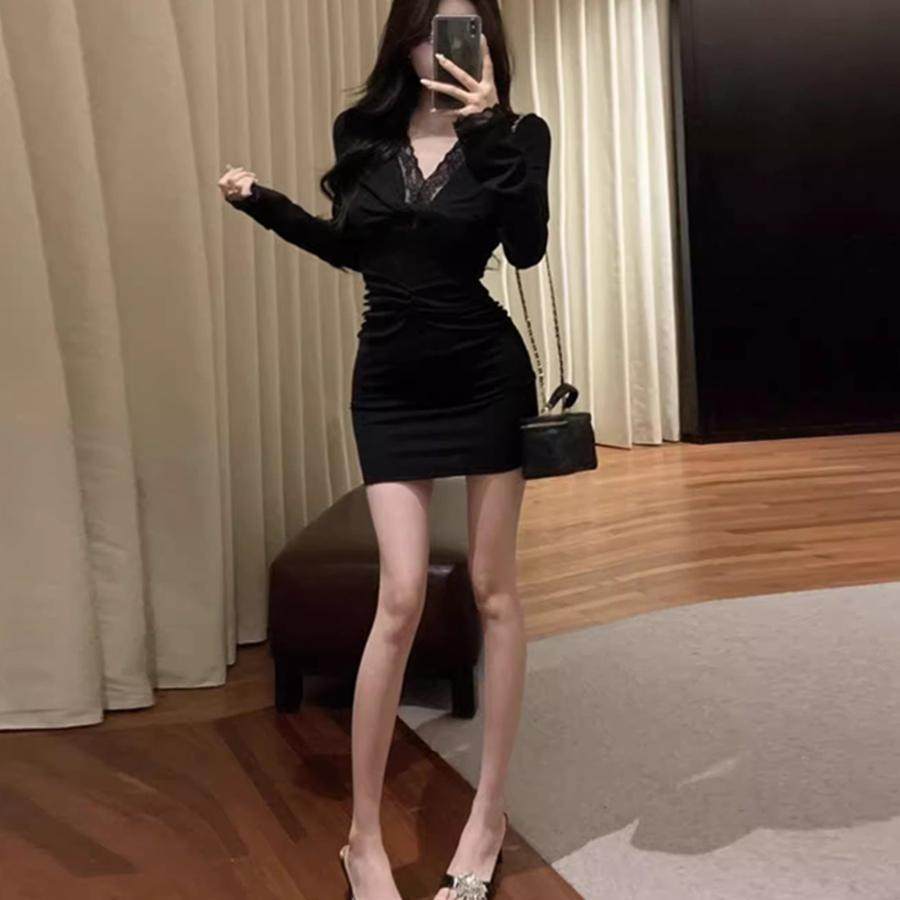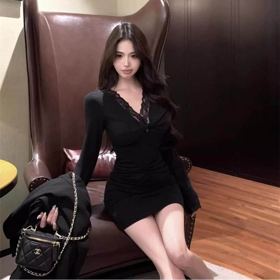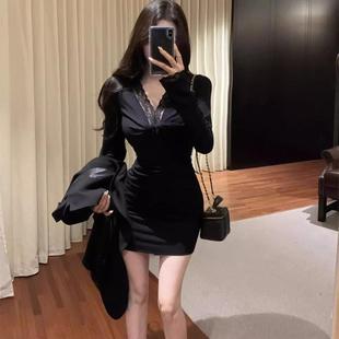 辣妹设计感扭结长袖 内搭打底性感包臀裙子 黑色蕾丝连衣裙女秋冬季