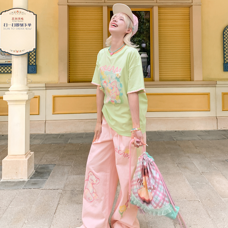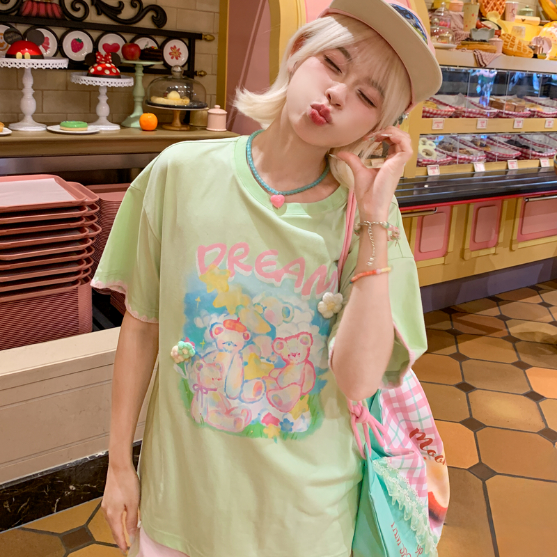 森女部落设计感卡通可爱小熊宽松绿色上衣2025夏小个子短袖 T恤女