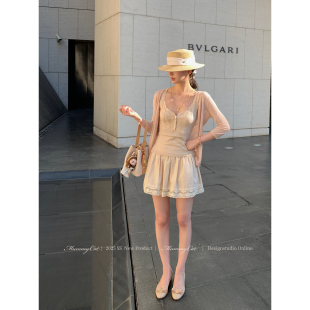 新品 Mummy 花与爱丽丝 下蛋喵 亚麻棉蕾丝褶皱A字短半裙 Cat