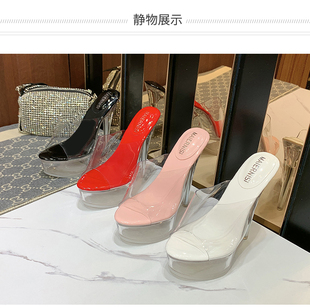 14cm透明水晶鞋 43码 情侣变装 高跟后空女凉拖35 大码 超高跟果冻鞋