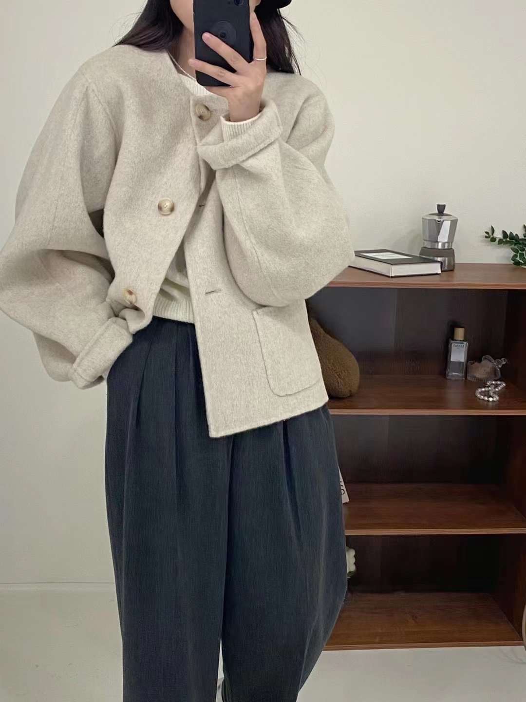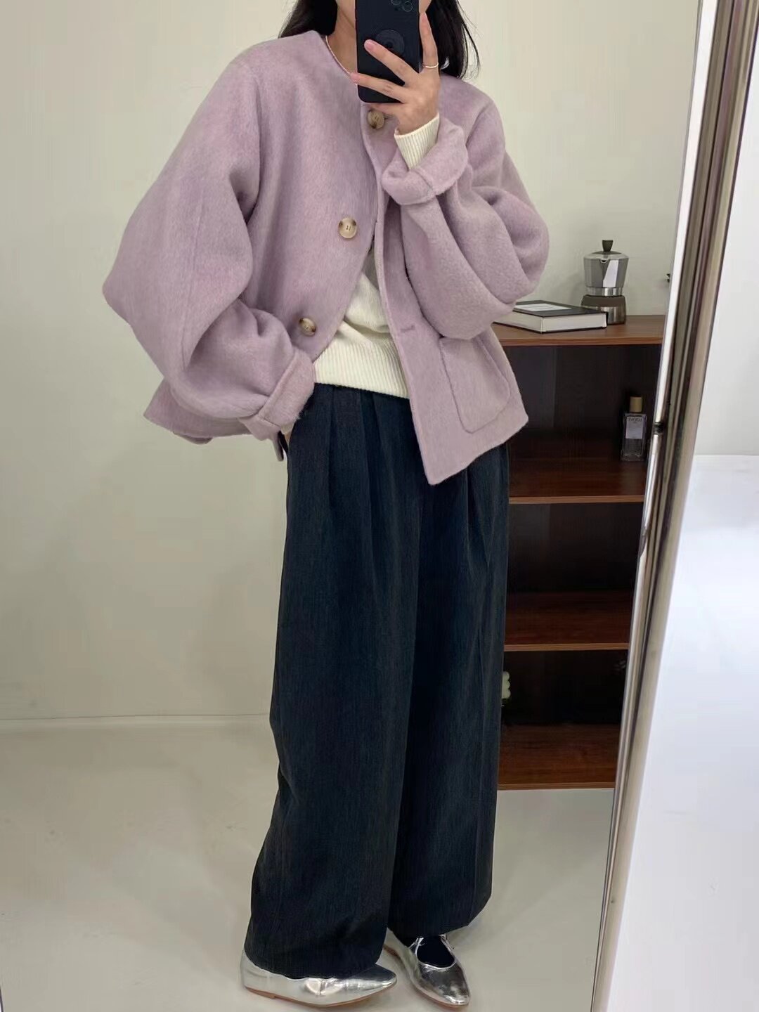 handmade紫色双面羊绒大衣女2024年新款 圆领单排扣宽松外套潮 短款