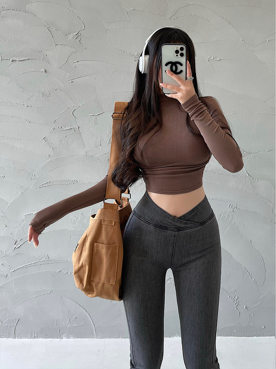 T恤上衣 长袖 YoungGirlDay纯欲性感紧身显瘦小高领短款 露脐打底衫