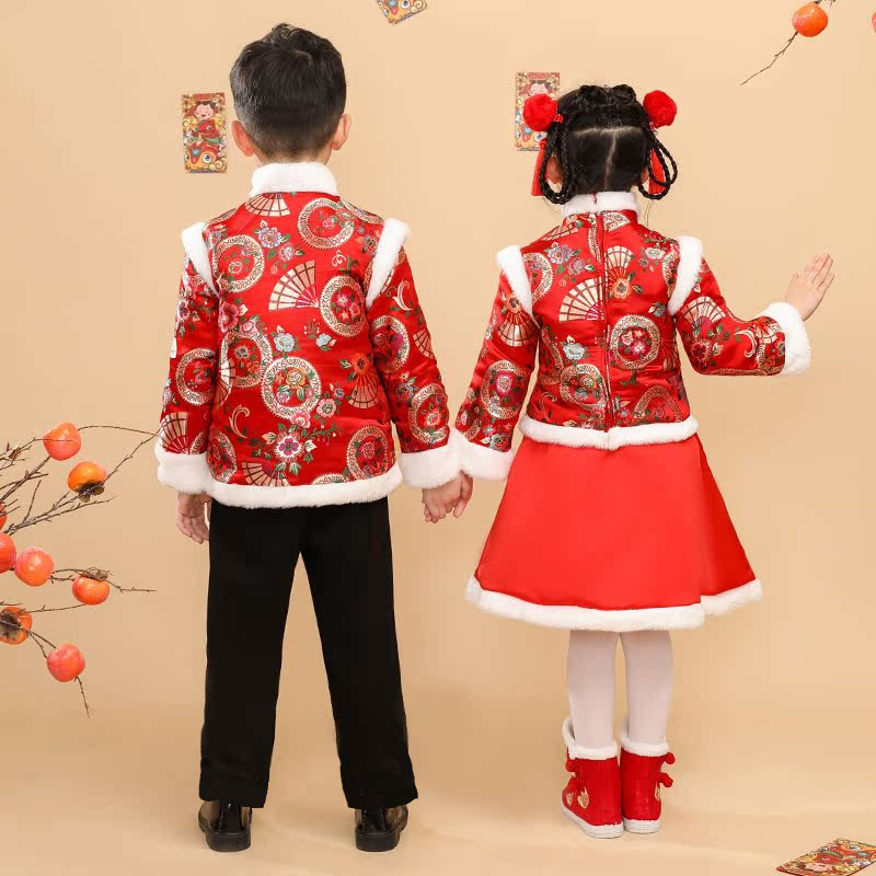 嘟嘟家男童卫衣红色儿童拜年服上衣女童洋气加绒男童新年装 演出服