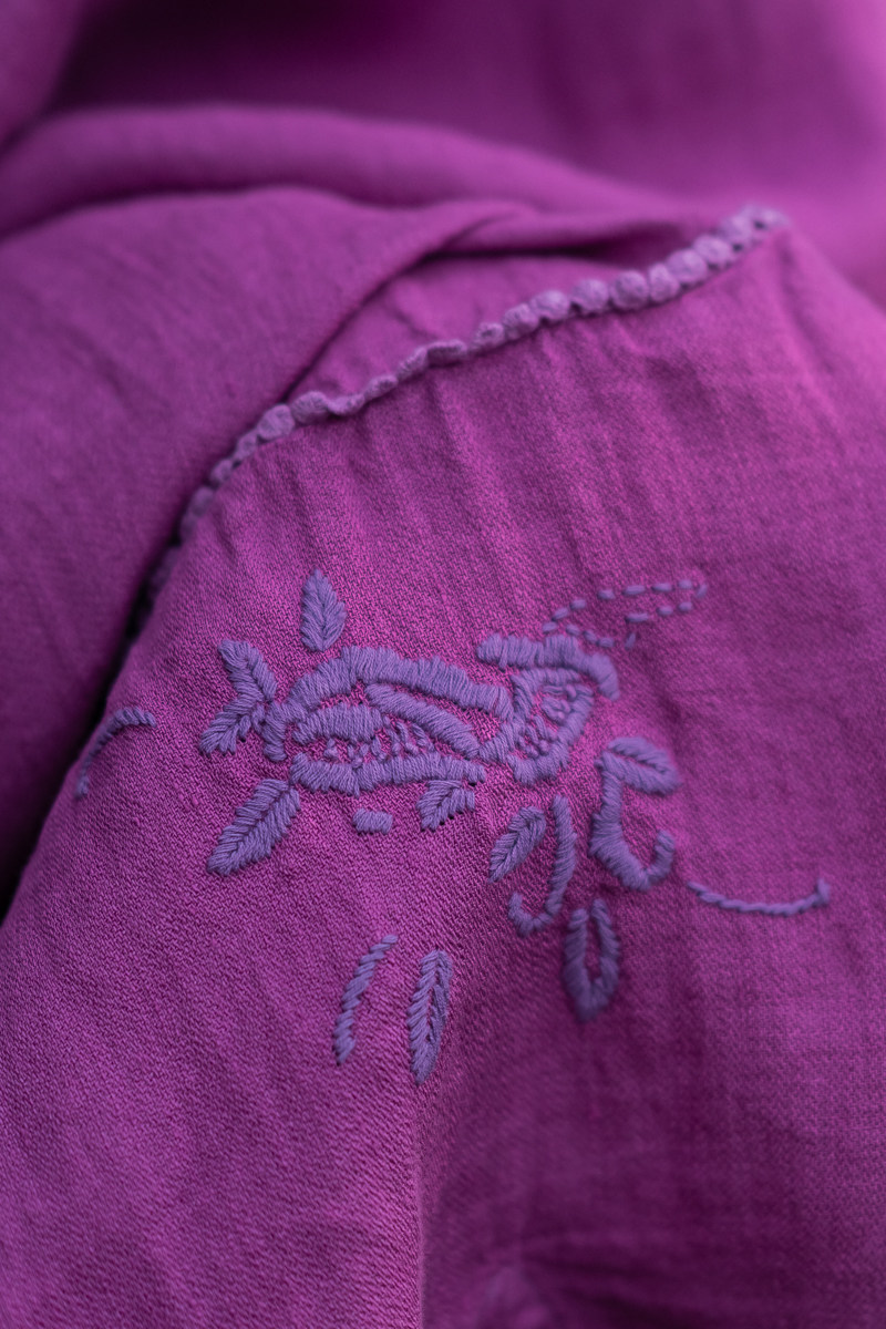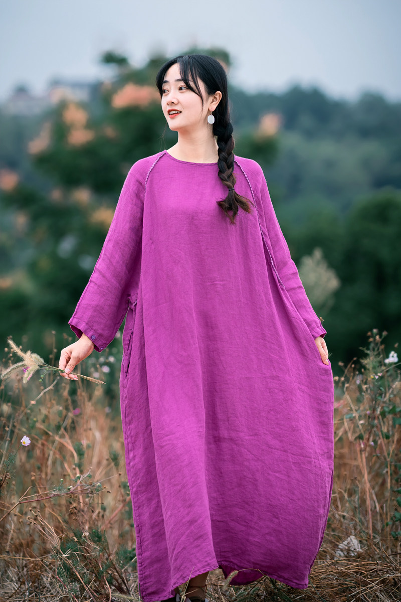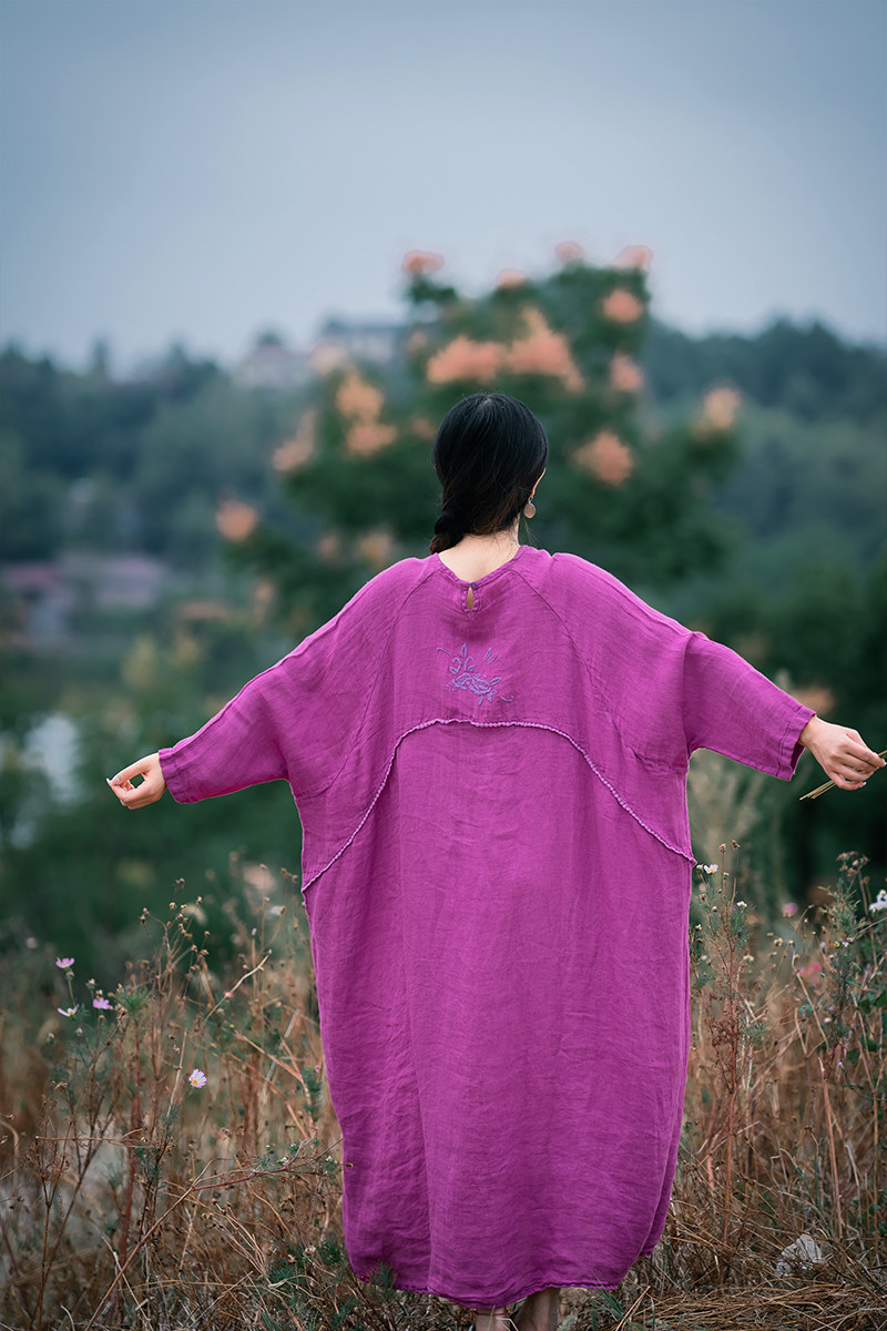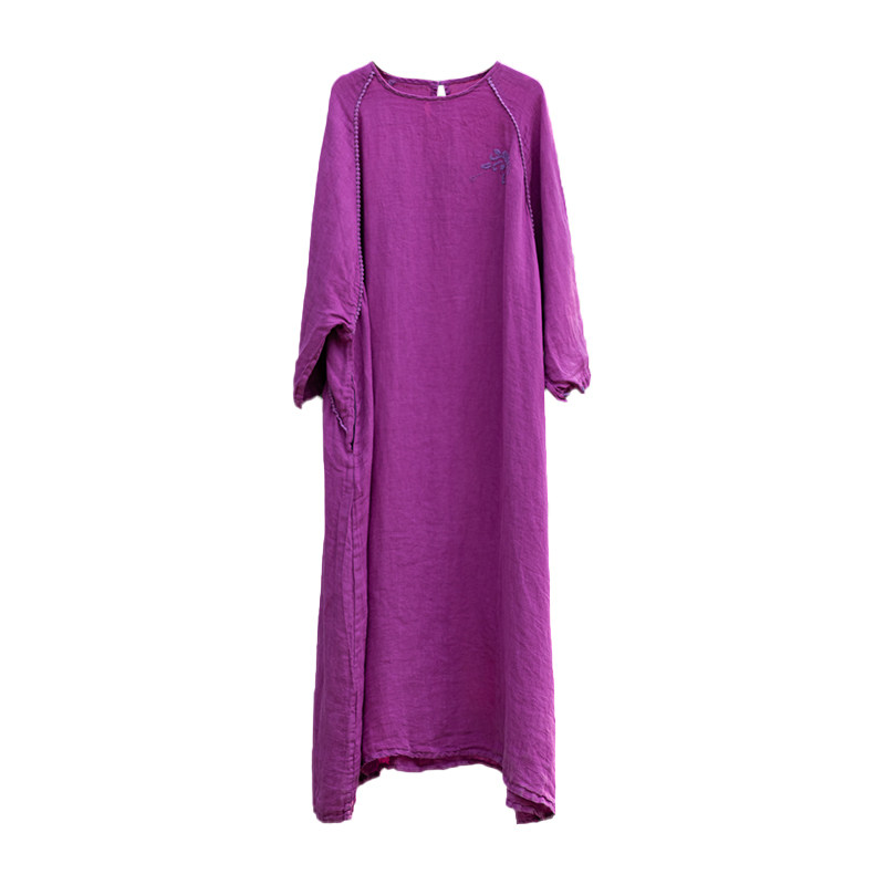 紫色重工刺绣亚麻宽松连衣裙 知笔墨原创设计禅意复古早春长袍子