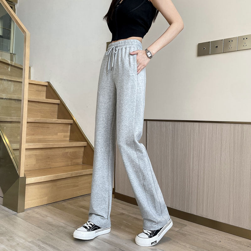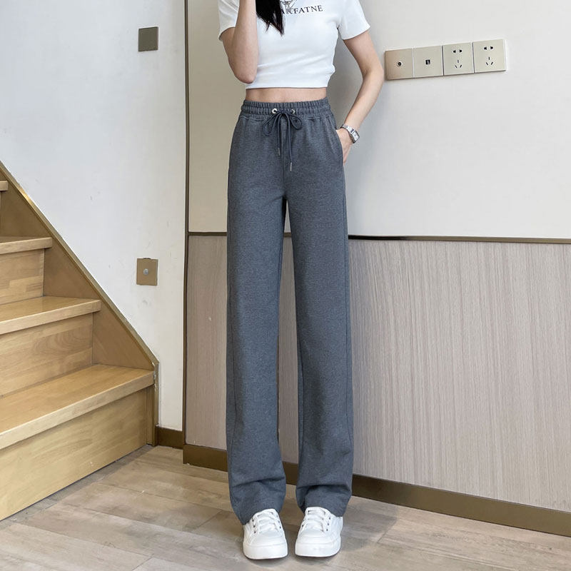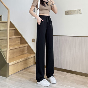 棉质加长高个子大码 女高腰垂感夏薄款 休闲 阔腿直筒运动裤 黑色窄版