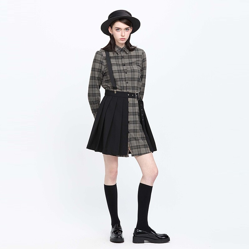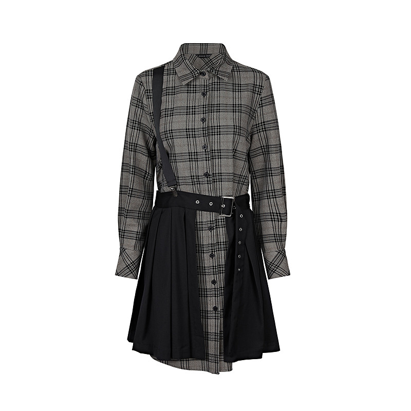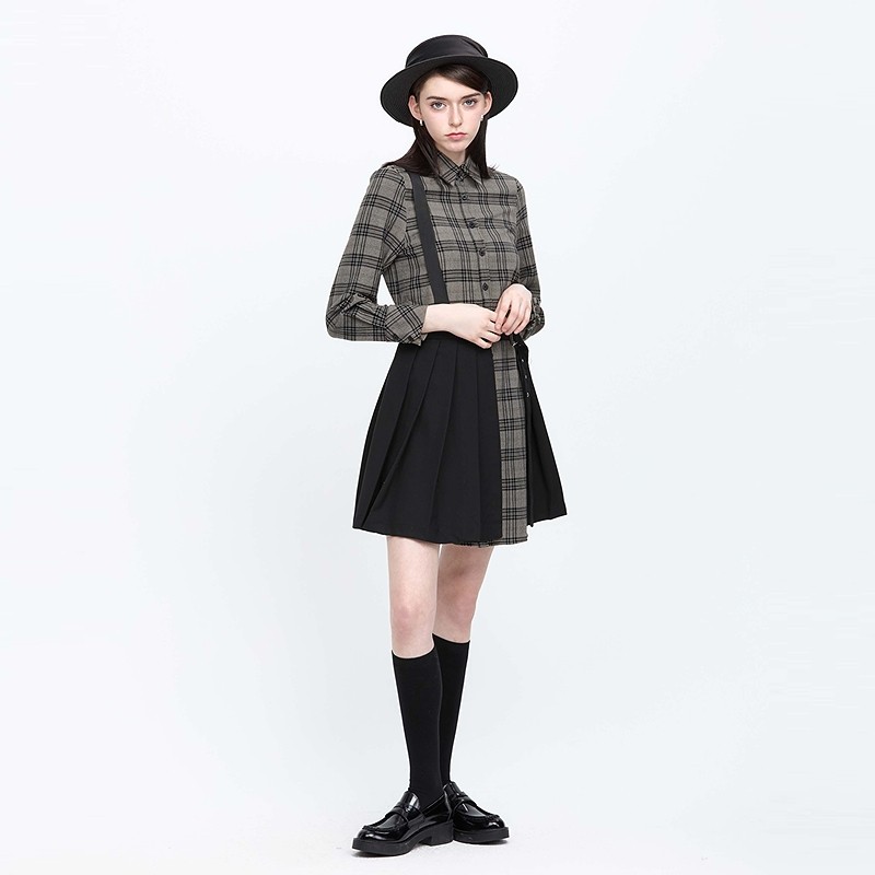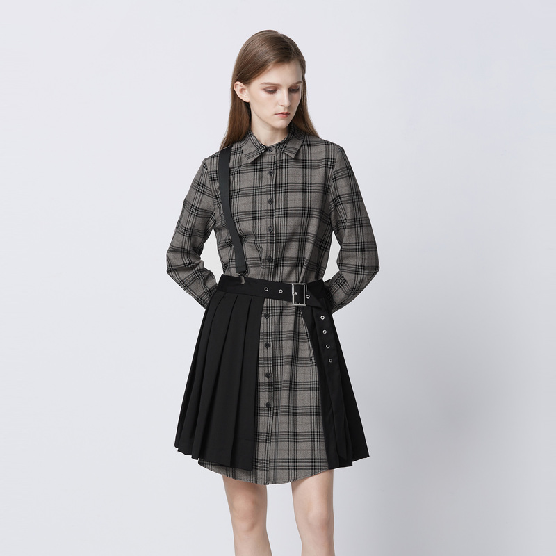 连衣裙S21381201 长袖 sdeer圣迪奥春秋装 学院风翻领格纹拼接衬衫