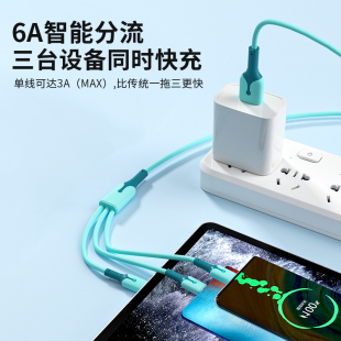 6A超级快充数据线三合一闪充适用苹果华为oppovivo安卓手机一拖三充电线器三头多功能加长车载通用3短款