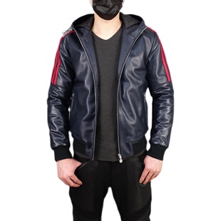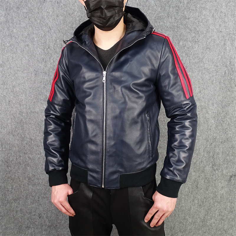 深蓝色撞色加棉 连帽帅气卫衣款 秋冬真皮皮衣男头层绵羊皮短款 修身