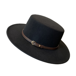 秋冬天英伦欧美风皮带扣平顶礼帽男女宽檐遮阳复古毛呢黑色爵士帽