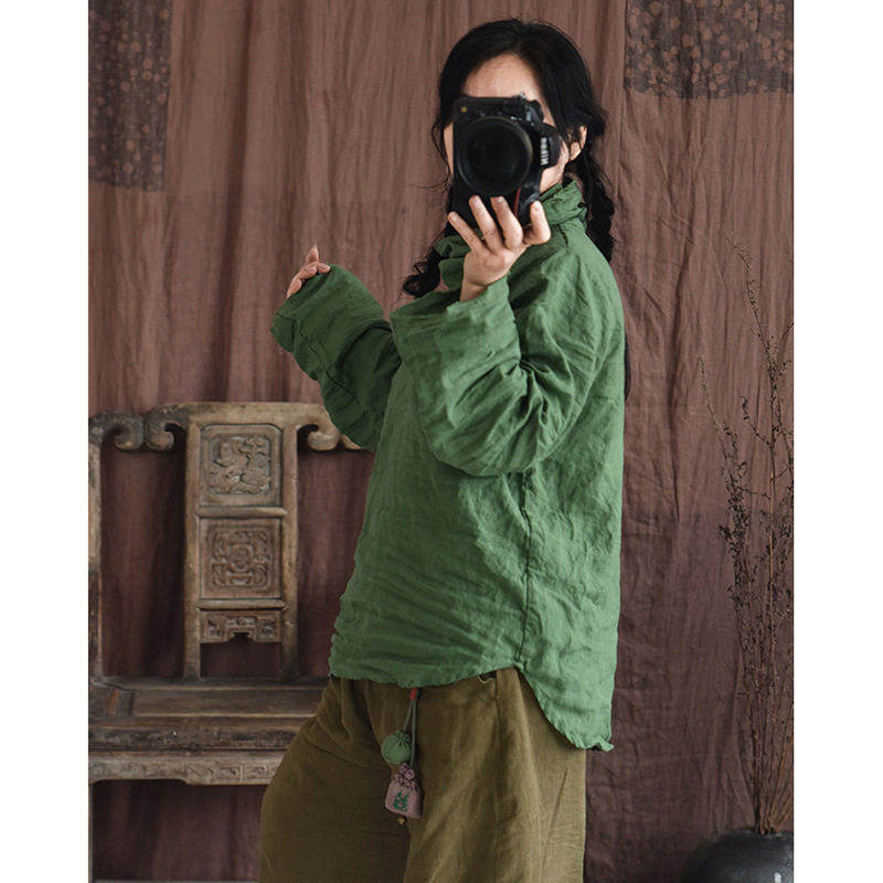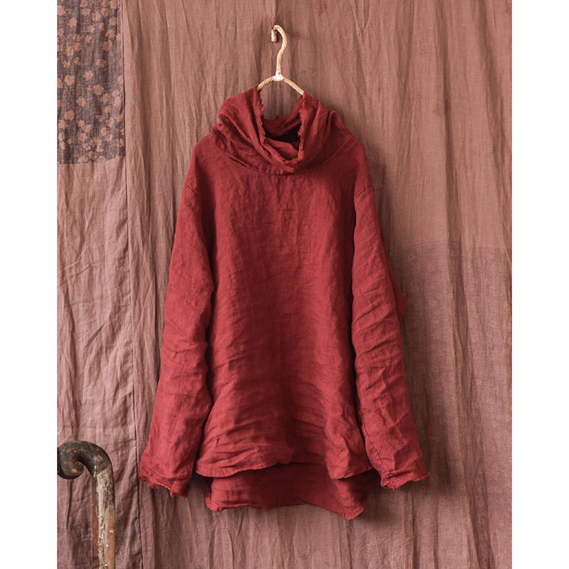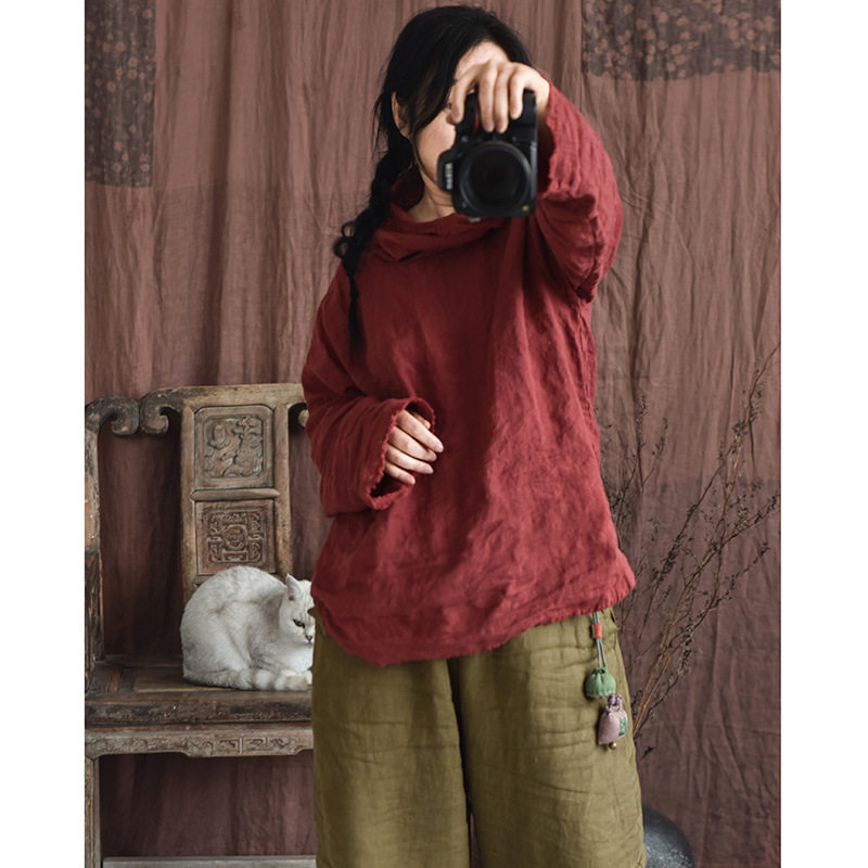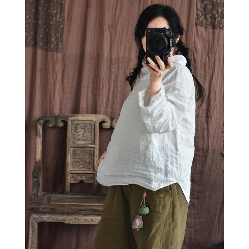 堆堆领混搭打底衫 2023自制四季 衬衫 砂洗亚麻手工缝线文艺女式 款