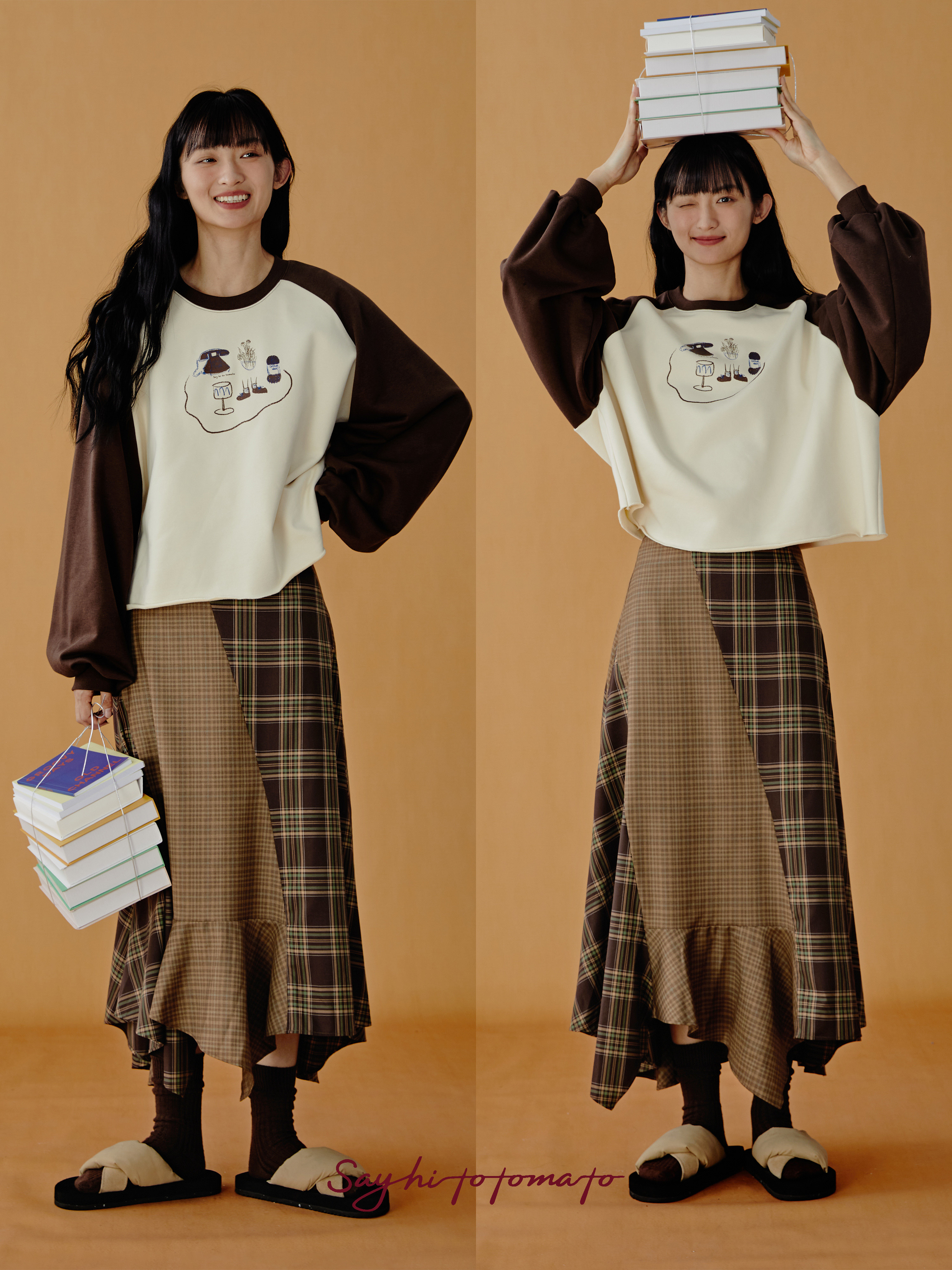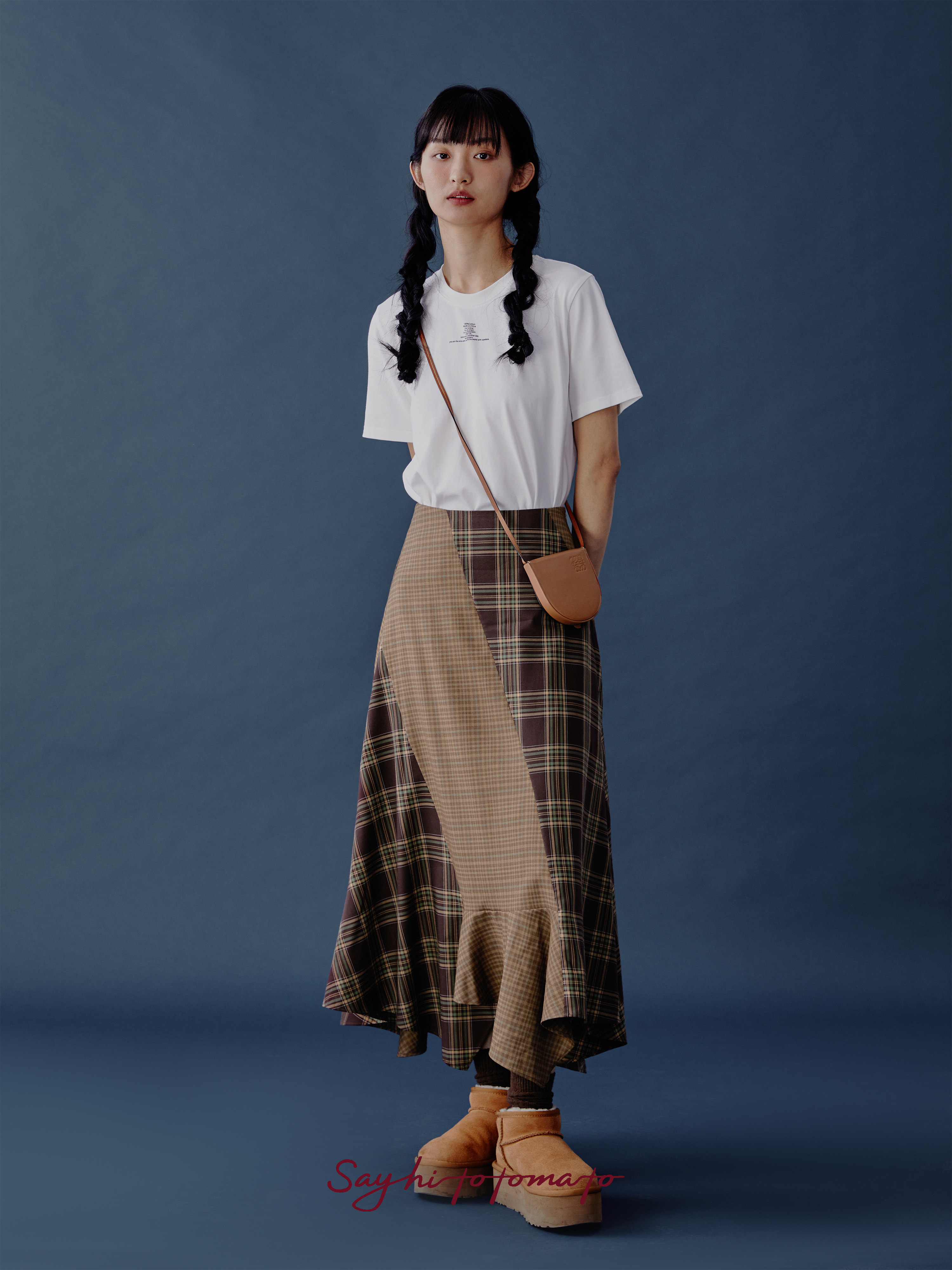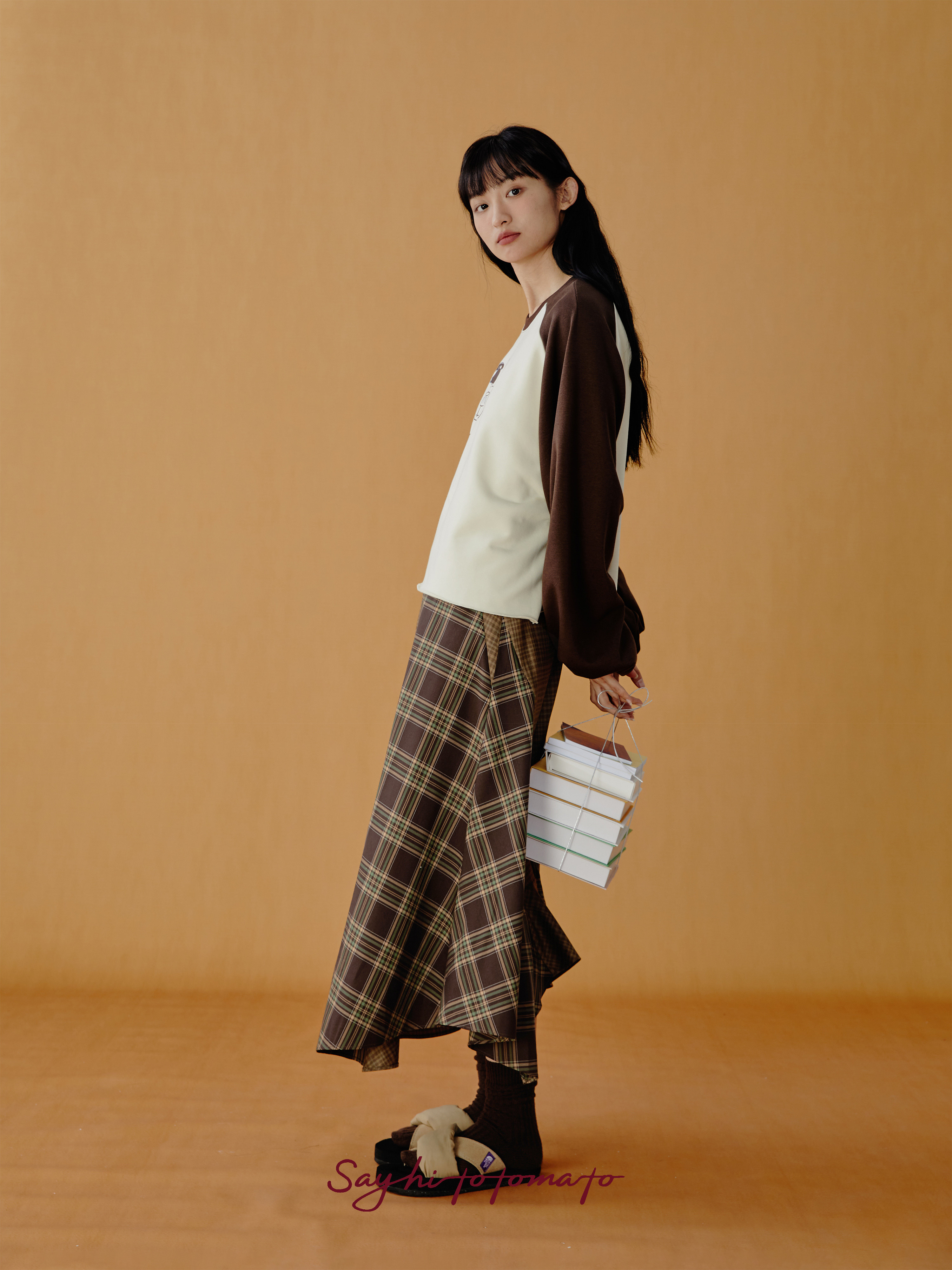 Sayhitotomato复古棕色格子撞色分割拼接不规则长款 显瘦鱼尾半裙