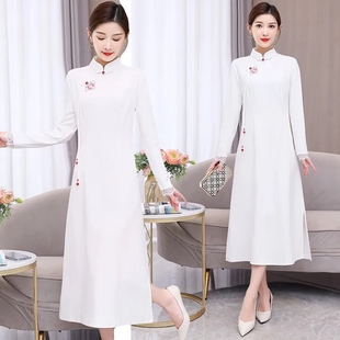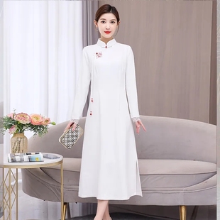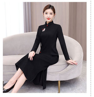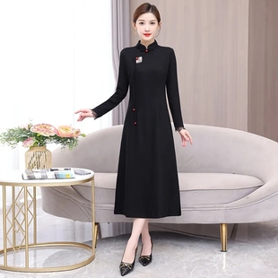 裙子春秋冬季 改良旗袍长款 复古盘扣茶服加绒连衣裙 女装 300斤大码
