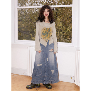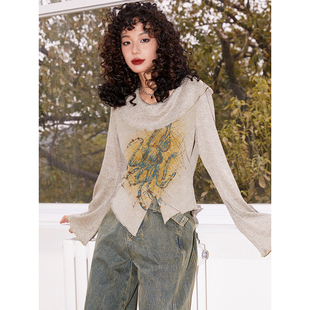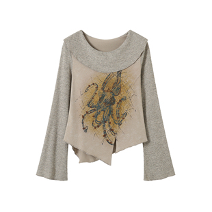 化学少女「海底异象」印花秋季 T恤女不规则设计感内搭上衣 长袖