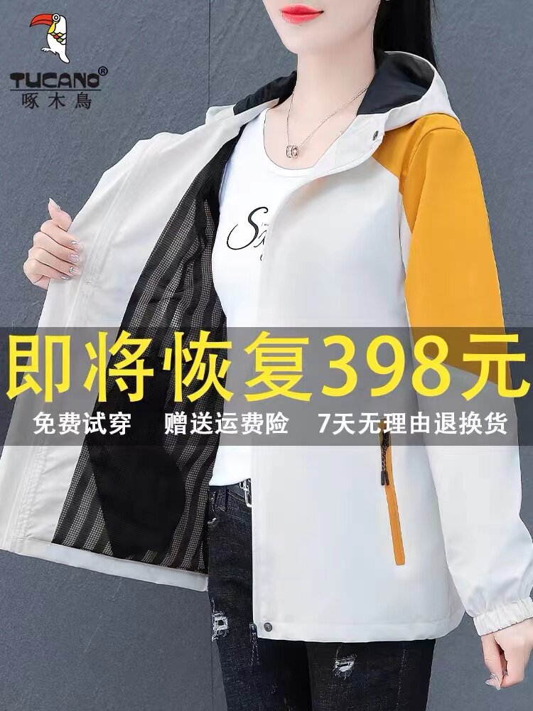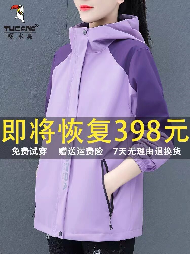 啄木鸟冲锋衣外套女秋冬季 百搭防风连帽风衣加绒双面穿上衣女潮
