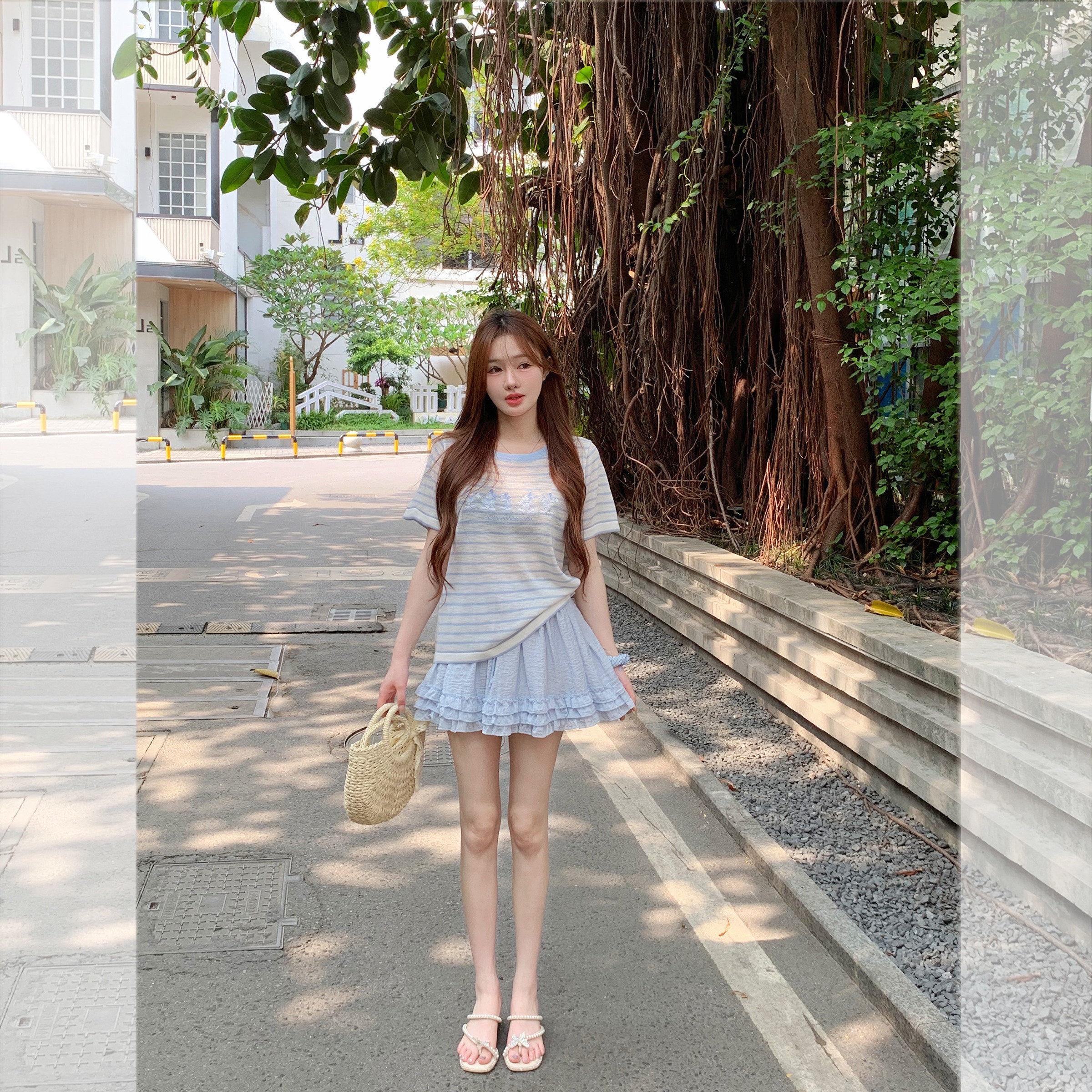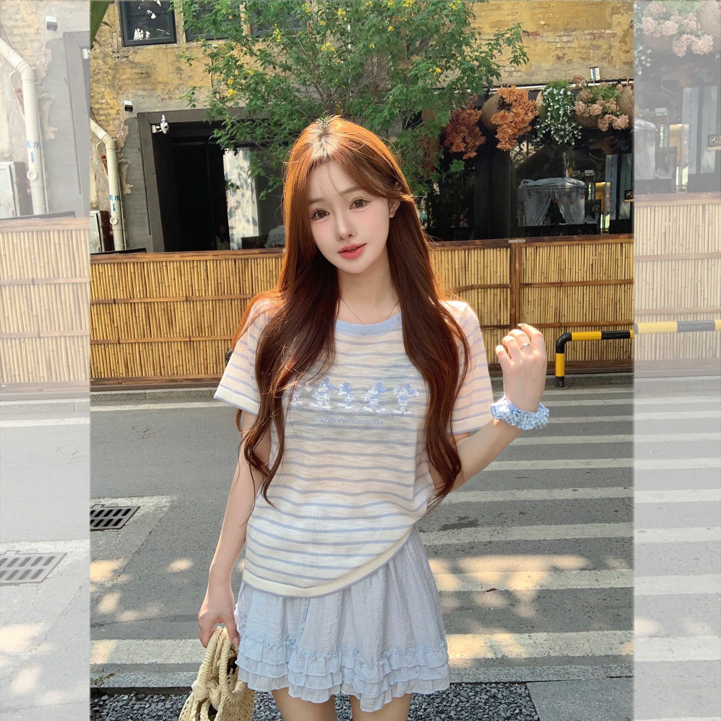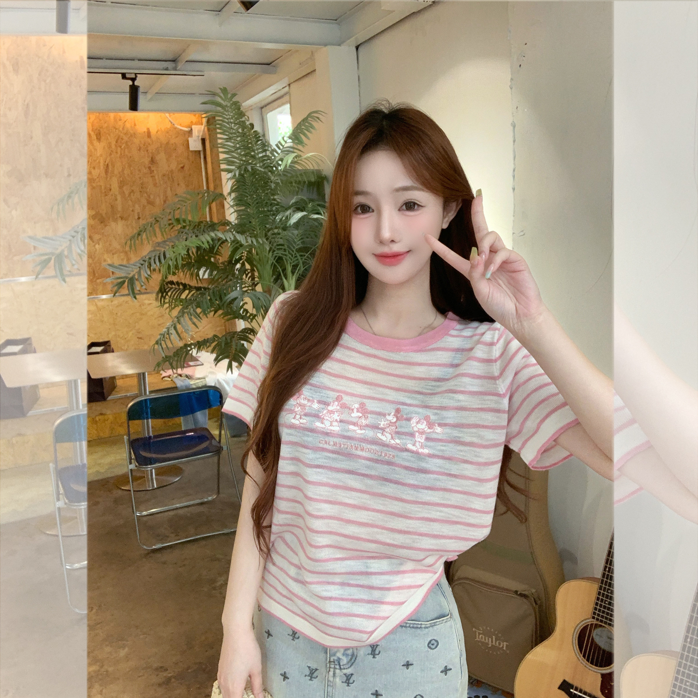 钟菲菲冰丝针织宽松短袖 条纹夏日独特漂亮上衣显瘦 女t恤2025新款