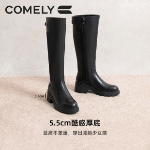 康莉商场新款 真皮粗跟不过膝高筒靴松糕底长筒靴 牛皮骑士靴女冬季