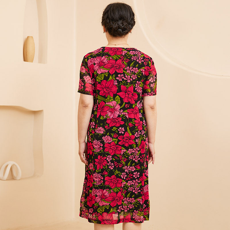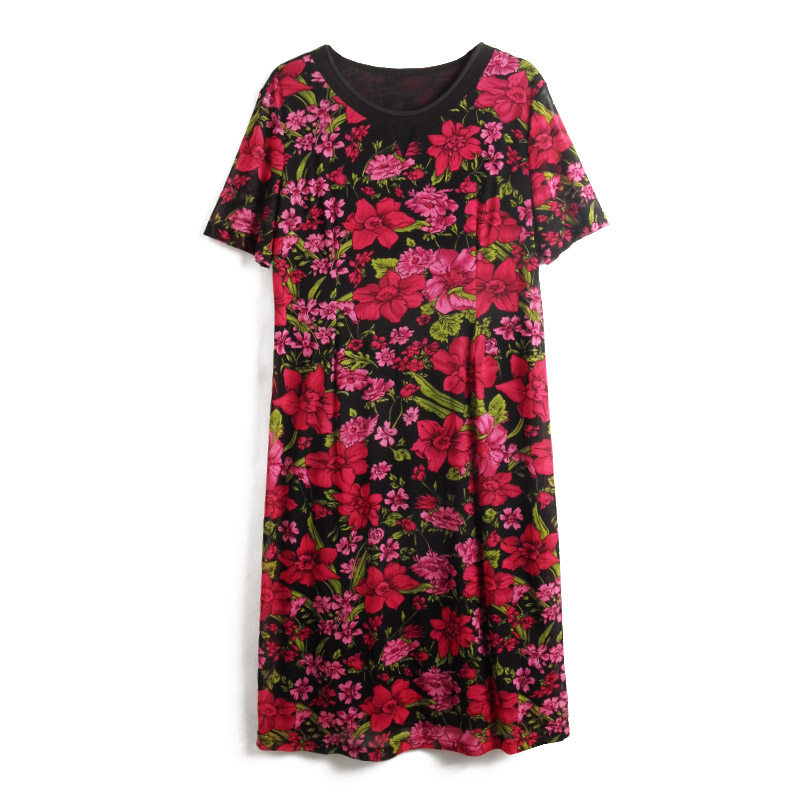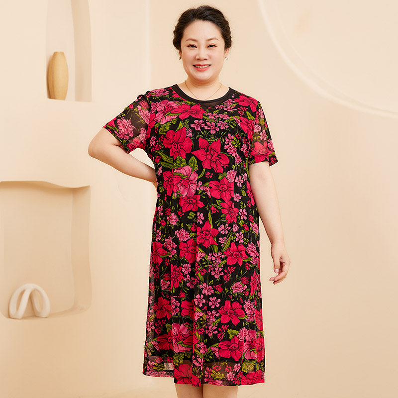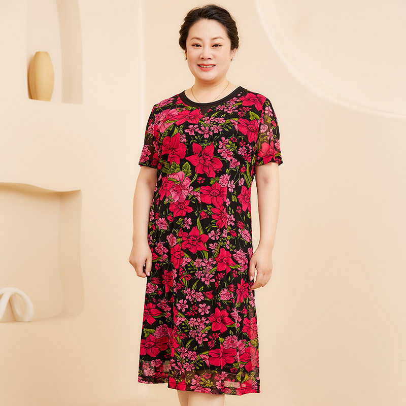 圆领花朵图案短袖 胖太太大码 新款 夏季 中长连衣裙潮724219540 女装