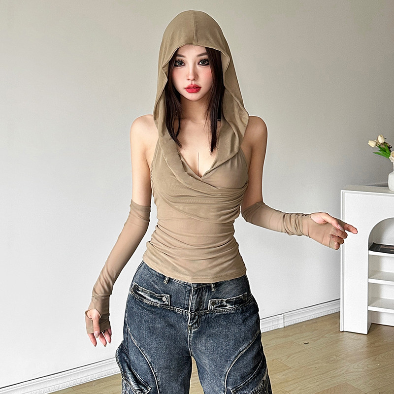 带袖 怪诞女孩 修身 背心女 套辣妹上衣 沙丘废土风复古纯色连帽无袖