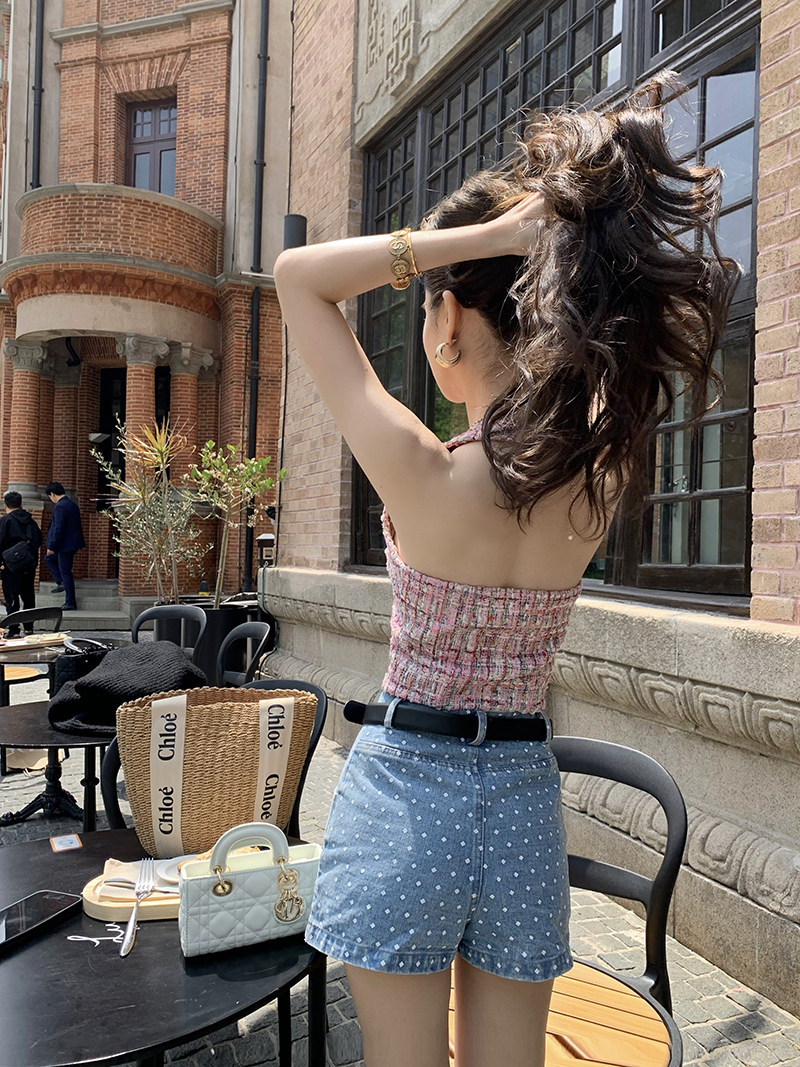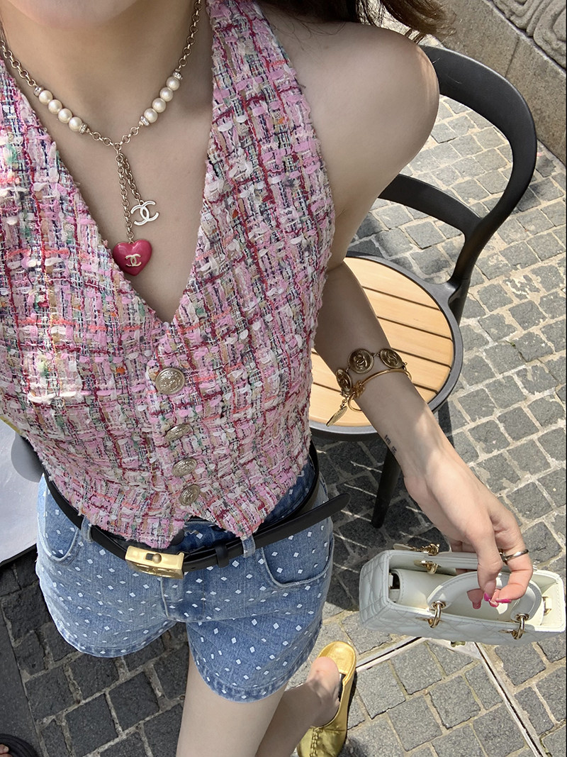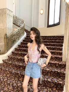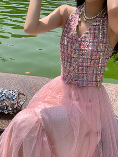 YEXIAOTING叶小婷 粉色挂脖小香风背心吊带上衣V领女夏 半杯荔雪