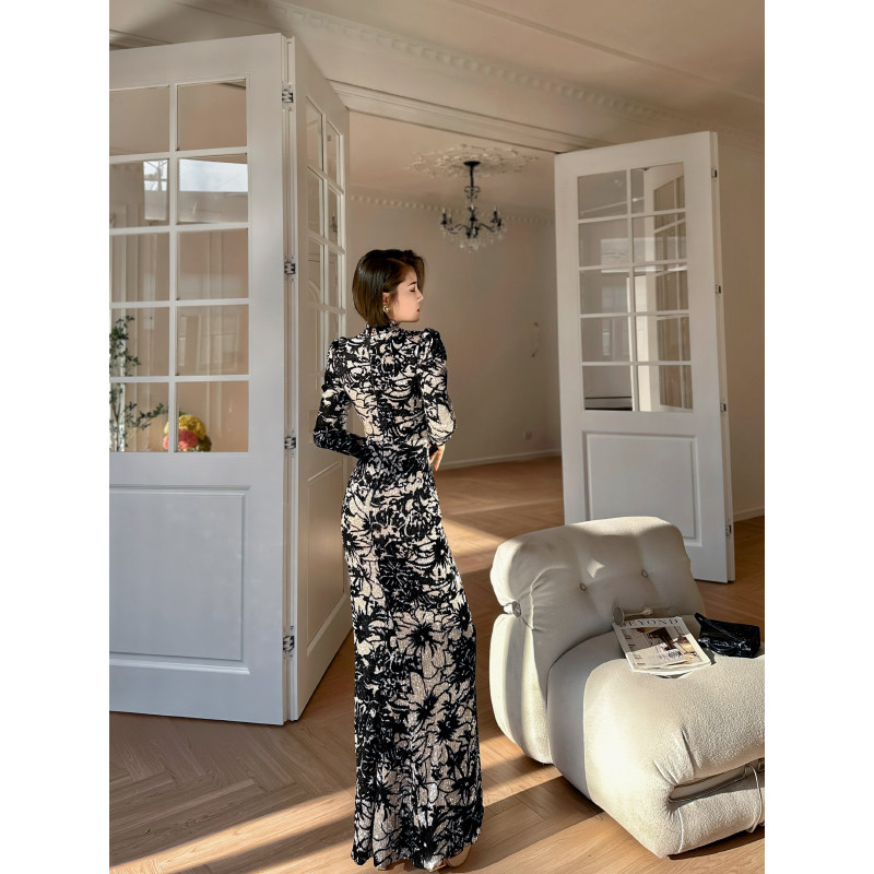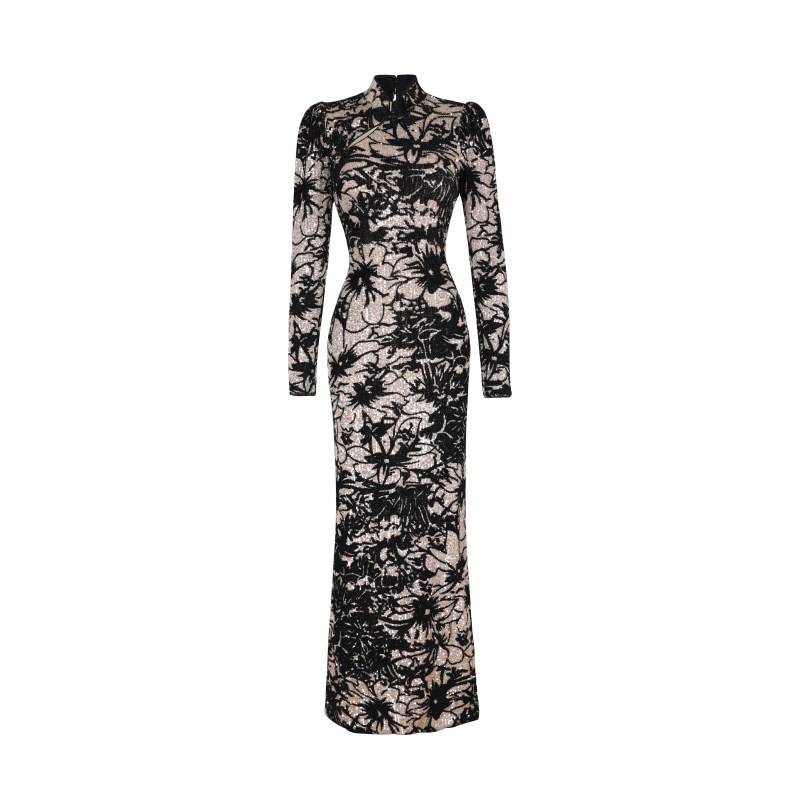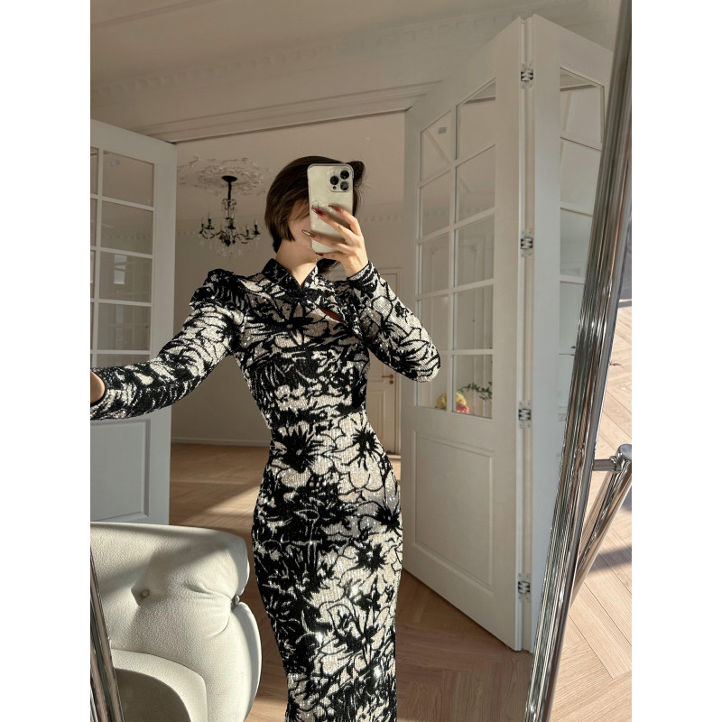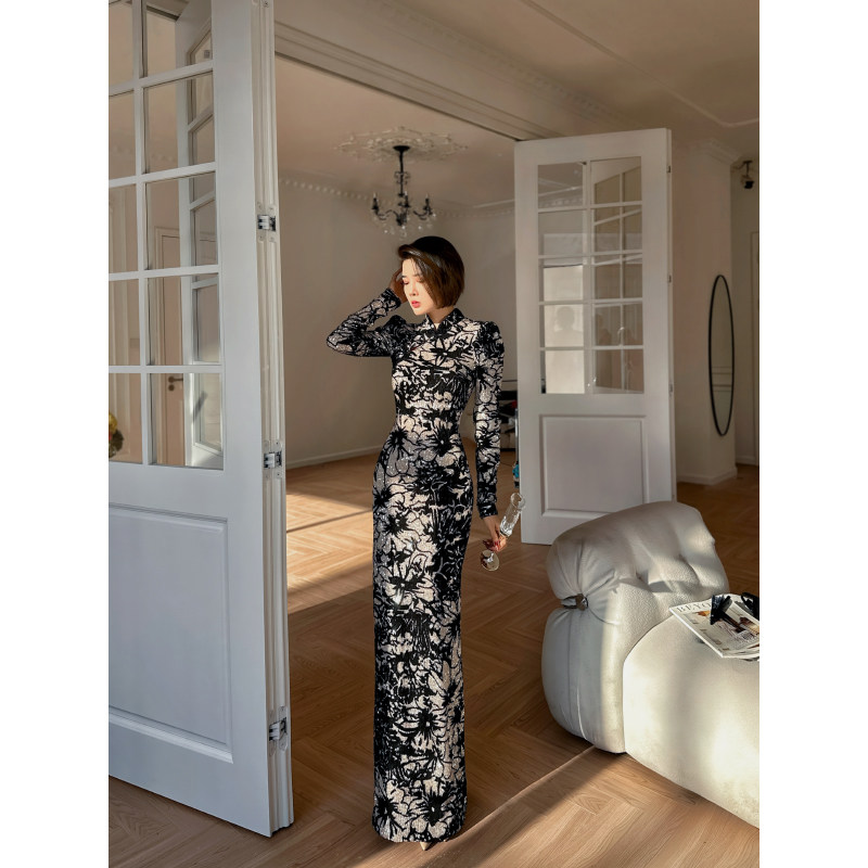 连衣裙 加绒加厚刺绣改良气质长袖 凌茜新中式 黑色丝绒旗袍秋冬新款