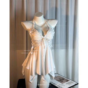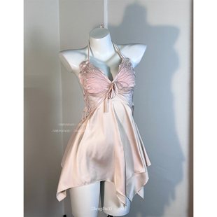 郑大嘻 纯爱小蛮腰·性感女睡衣冰丝吊带蝴蝶睡裙高级蕾丝带胸垫