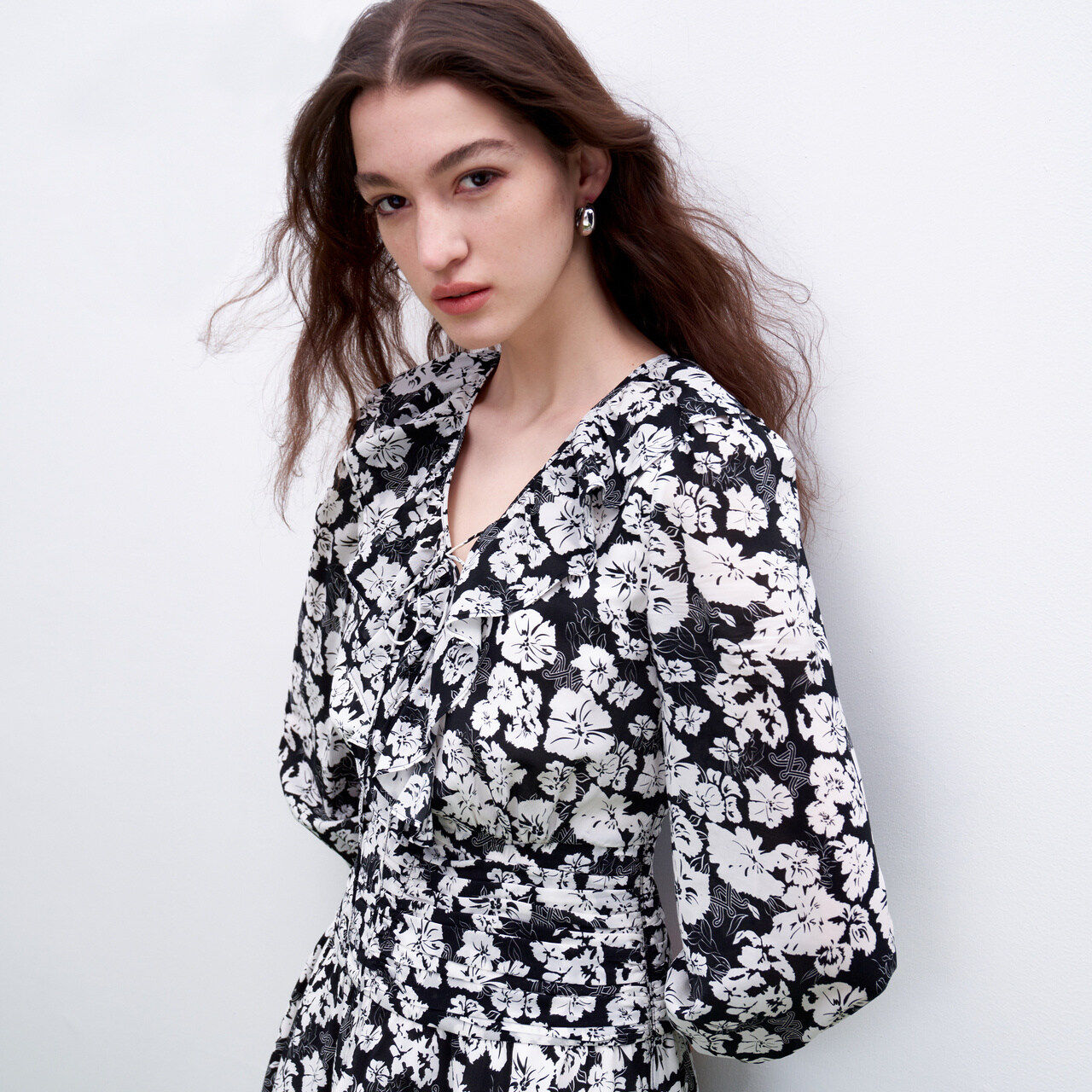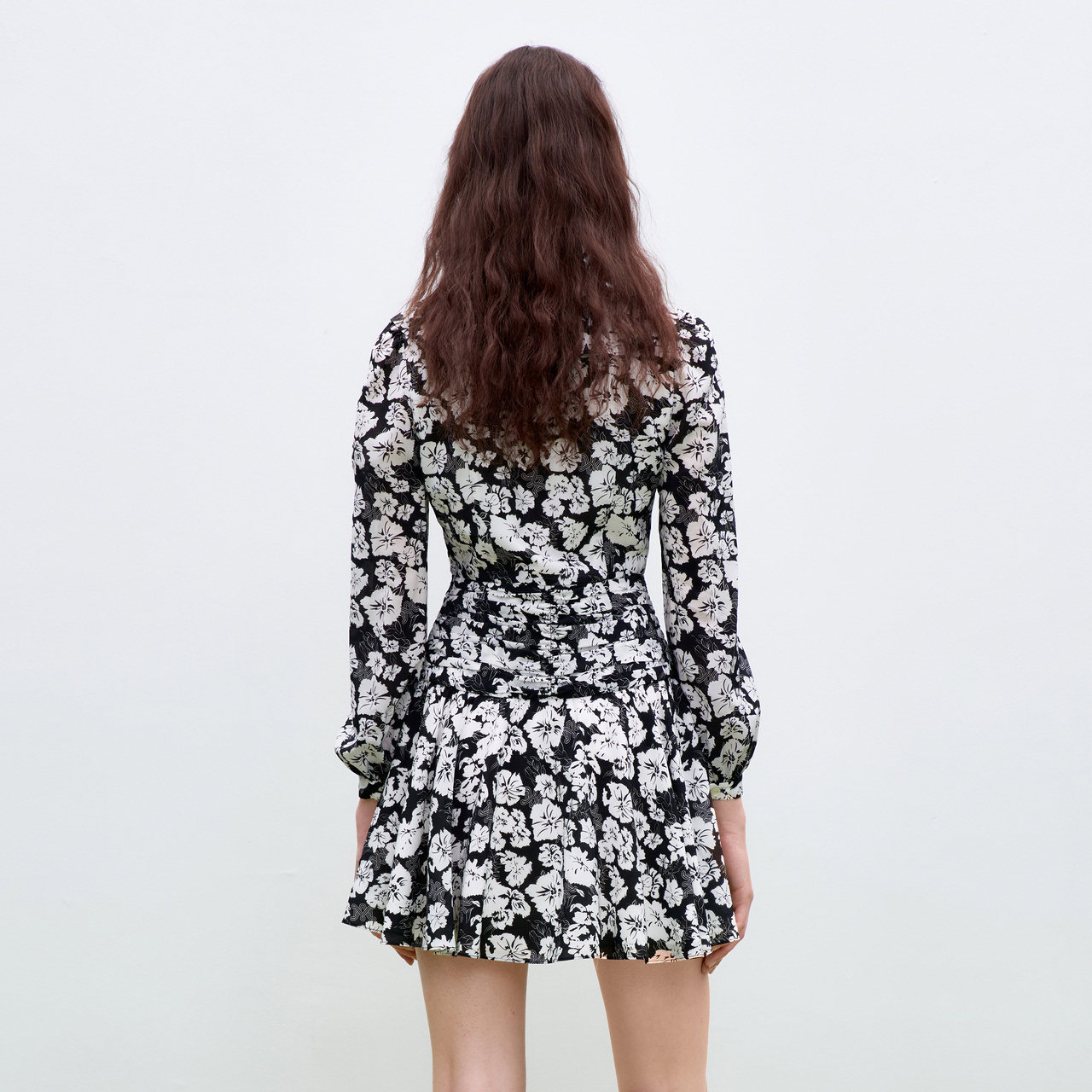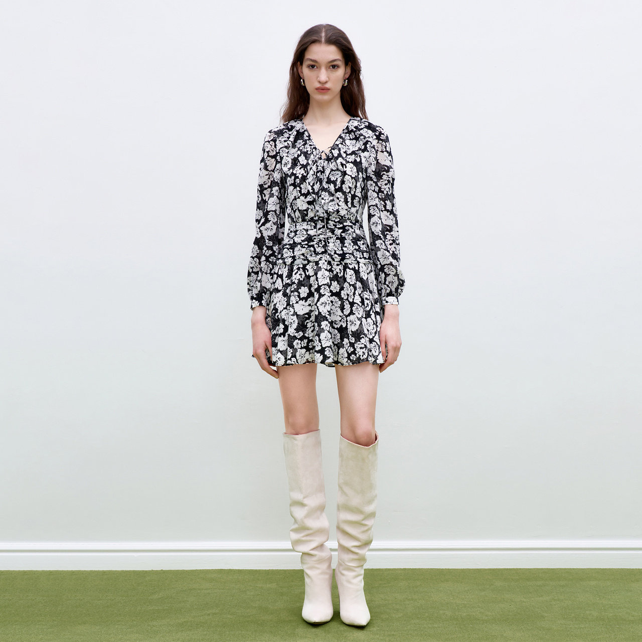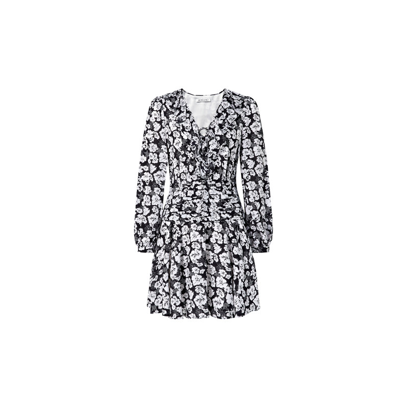 长袖 V领系带黑白芍药印花短款 连衣裙女 摩萨克秋装 商场同款