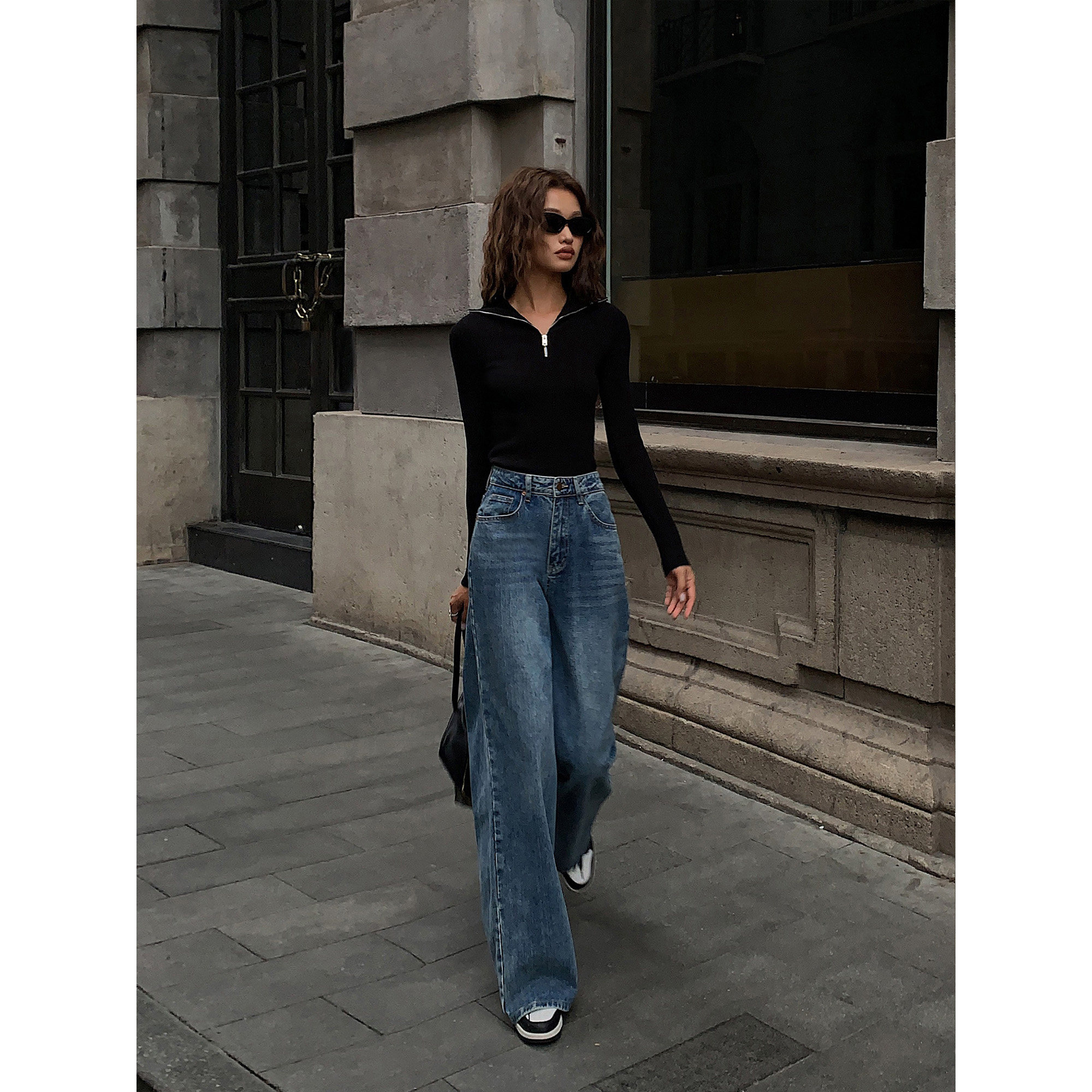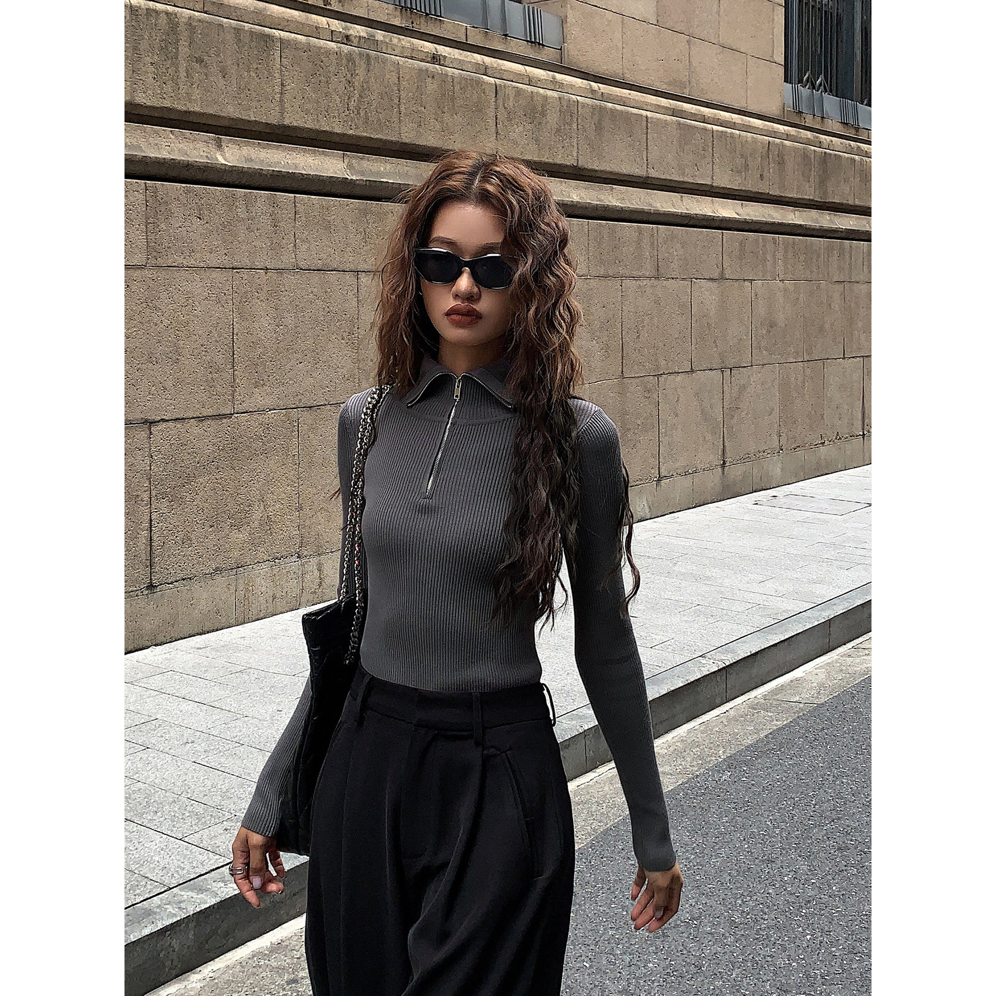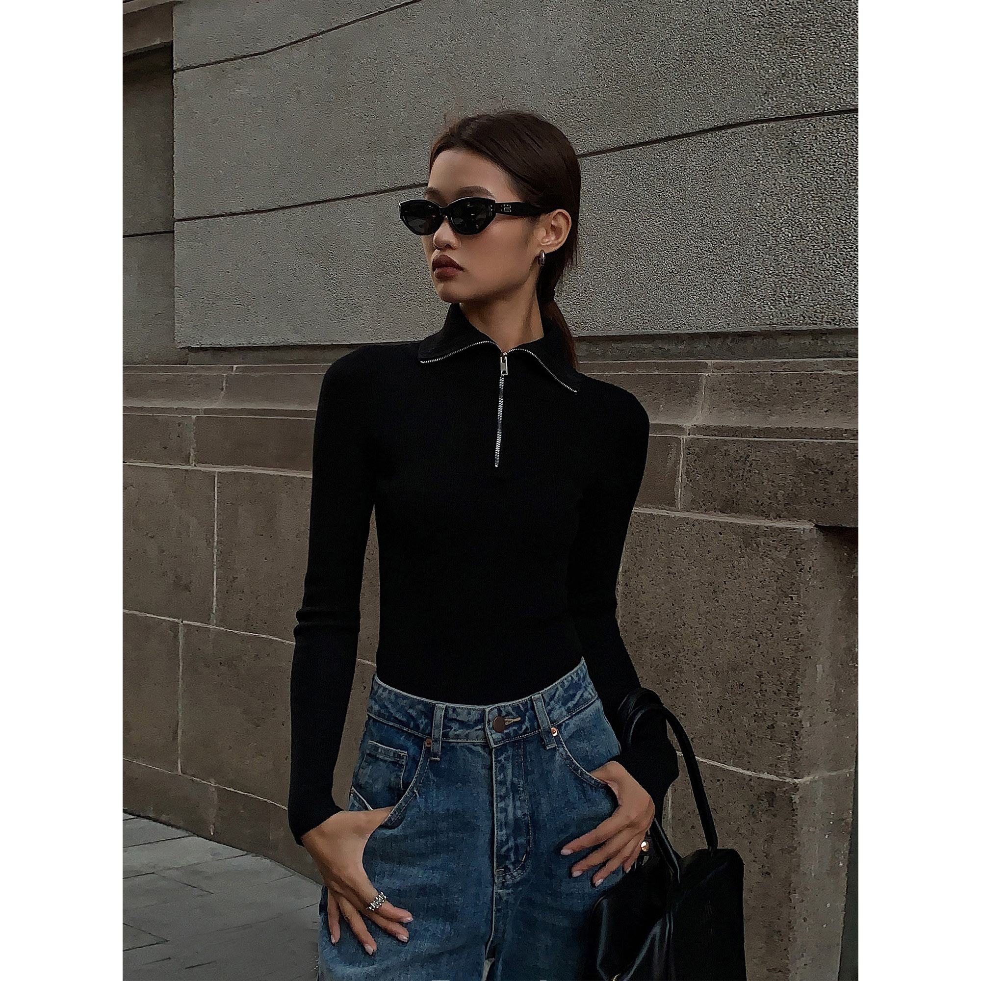 女修身 ousph 针织衫 polo领拉链长袖 显瘦毛衣打底上衣 现货4折