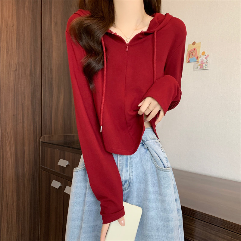 女2024年新款 短款 复古红色连帽长袖 不规则修身 上衣 卫衣打底衫 春装