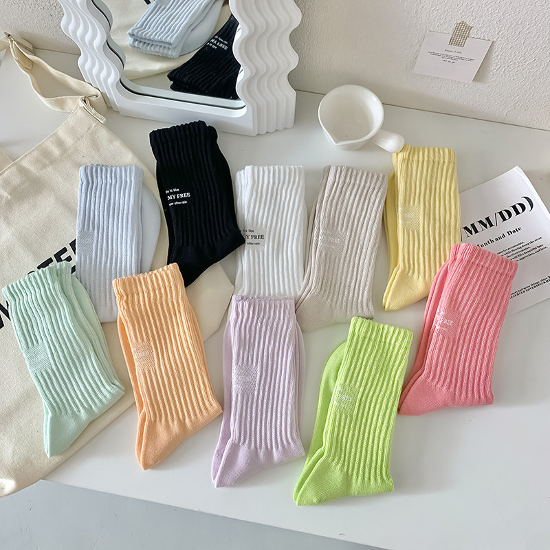 多巴胺彩色袜子女纯色竖条纹中筒袜日系纯棉秋冬款 穿搭显瘦堆堆袜